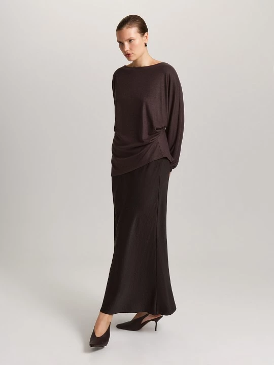 Блузка с асимметричным вырезом — воплощение художественной смелости и утонченного комфорта, где каждая деталь участвует в создании неповторимого образа. Лодочка мягко обрамляет линию плеч, добавляя образу современную изысканность, в то время как игра контрастов — цельнокроеный левый рукав и втачной правый — превращает каждое движение в элемент перформанса. Складки по левому боковому шву создают объем и динамику, а разрез по правому с асимметрией добавляет ноту дерзости, делая модель настоящим произведением fashion-искусства. Меланжевый трикотаж с фланелевым эффектом в благородном кофейном оттенке — это гимн тактильному удовольствию. Ткань вискозы, полиэстера, овечьей шерсти и спандекса сочетает в себе лучшее: нежность вискозы, прочность полиэстера, природное тепло шерсти и идеальную эластичность. Этот состав дарит коже ощущение комфорта весь день. Такой асимметричный лонгслив - это готовый художественный образ — вещь, которая будет выделять из толпы, подчеркивая индивидуальность и безупречный вкус.