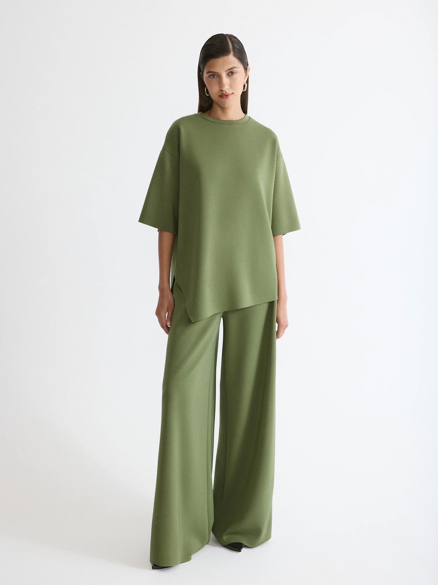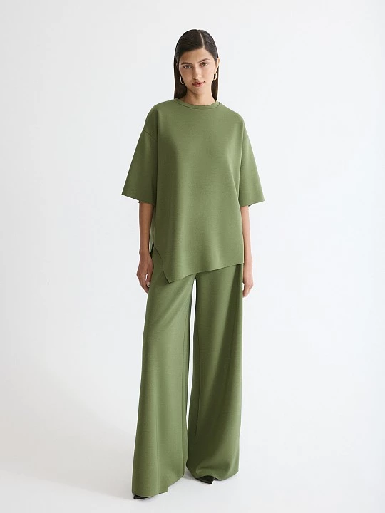 Блуза свободного кроя в благородном оливковом - незаменима для повседневной носки. Короткие рукава со спущенным плечом и круглый вырез создают актуальный силуэт, идеально ровные срезы с эффектом "необработанного края" делают модель легкой.