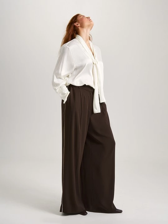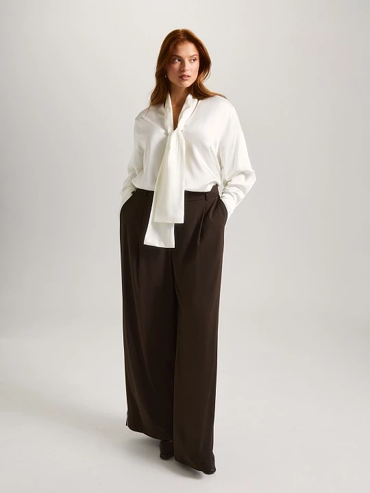 Блузка с привлекательным V-вырезом и притачным воротником-аскот. Рукав длинный, втачной, со спущенным плечом, широкий манжет придает блузе завершенный вид. Изделие тактильно приятно за счет хорошего содержания вискозного волокна и долго прослужит благодаря наличию в составе полиэстера. Романтичная модель больших размеров будет востребована как деловая, офисная, школьная, повседневная, нарядная, вечерняя, праздничная.