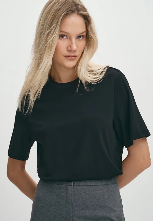 Выбрали для базовой футболки качественный вискозный трикотаж. Такое полотно отличается высоким тактильным качеством, прочностью и эластичностью.