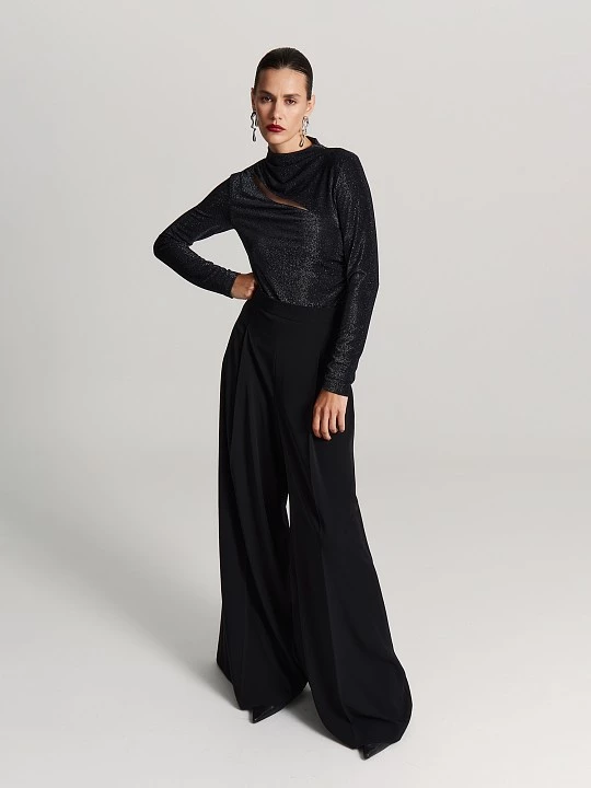 Блуза с необычным вырезом из искрящейся ткани - участник многих вечерних образов.