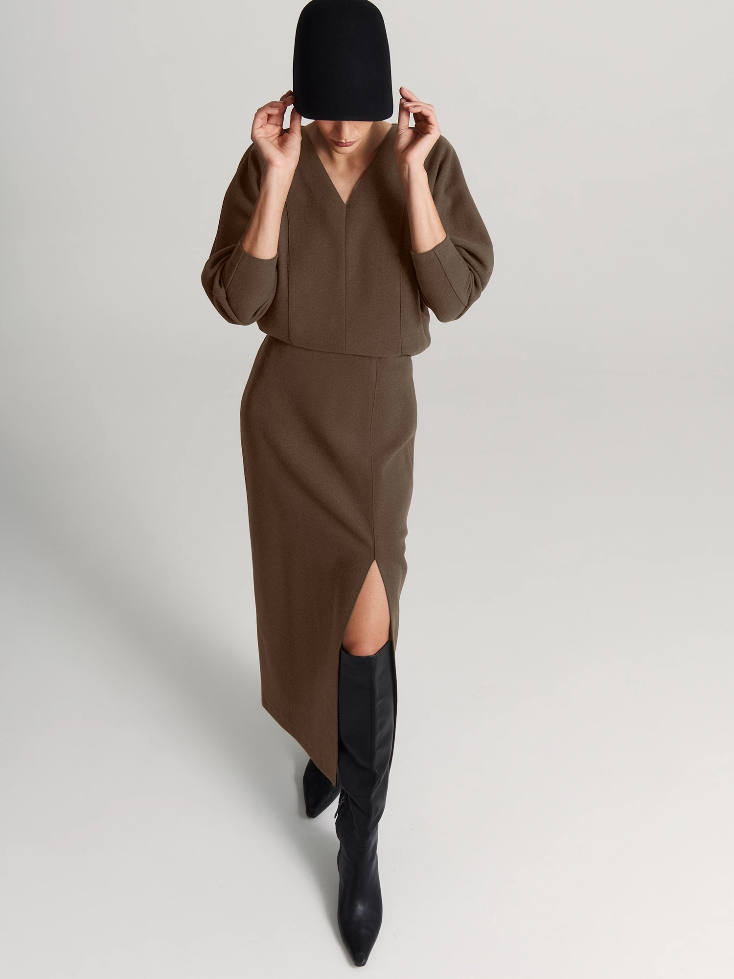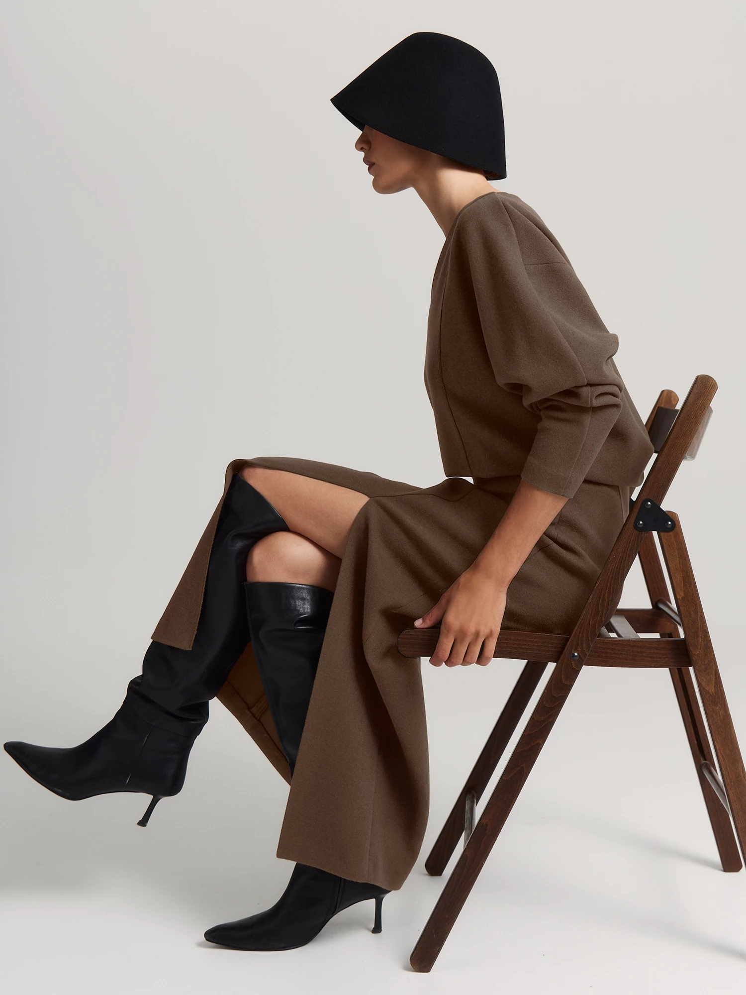 Насыщенный оттенок «шоколадный мартини» выглядит благородно и сочетается с юбкой SK0594K, брюками и джинсами коллекции.