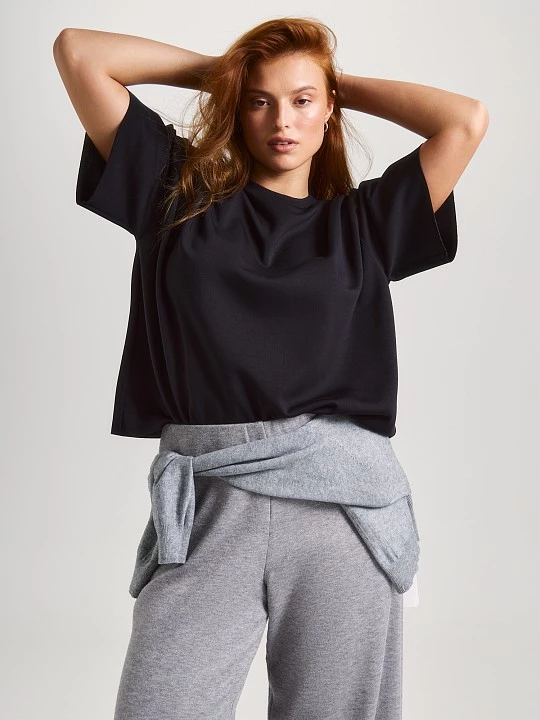 Блуза свободного кроя с коротким рукавом - это дуэт комфорта и стиля. Спущенное плечо и мягкий силуэт создают расслабленный, но при этом эффектный образ, а аккуратный круглый вырез подчеркивает естественную линию шеи, добавляя образу легкости. Металлическая брендированная нашивка — тот самый изящный акцент, который превращает базовую вещь в стильное заявление, сохраняя при этом ее вариативность: свитшот можно носить соло, сочетать с тонкой футболкой для многослойности или с лонгсливом в прохладные дни. Вискозный неопрен сочетает в себе лучшие качества волокон, входящих в его состав - пластичность и гибкость для идеальной посадки, прочность для долговечности и удивительную тактильную мягкость для комфорта. Благодаря модифицированной вискозе в составе ткань прекрасно пропускает воздух, обеспечивая комфорт даже при длительной носке, а добавление полиэстера и спандекса гарантирует модели формоустойчивость. Уверенный черный цвет делает модель по-настоящему универсальной базой для любого гардероба. Стиль с необработанными краями добавляет образу современности и дерзости, позволяя сочетать ее как с юбкой из неопрена для цельного ансамбля, так и с джинсами для повседневного образа. Эта блузка станет любимой вещью в самых разных ситуациях: для офиса она добавит образу современности, для школы — стильной индивидуальности, для спортивного стиля — необходимой свободы движений, а для повседневной носки — того самого комфорта, который хочется ощущать каждый день.