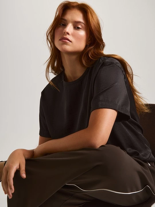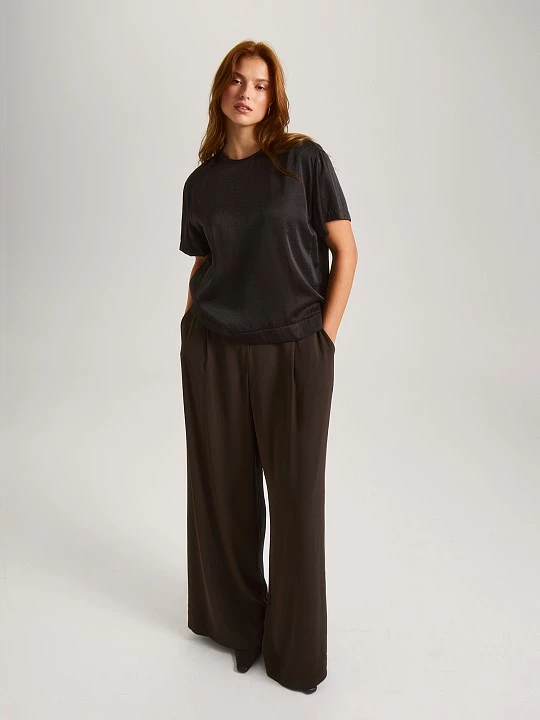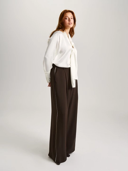 Блузка лаконичного кроя с коротким рукавом подойдет как первый слой к жакету, пиджаку, кардигану, а также составит образ с юбкой SK0567 из такой же ткани. Полуприлегающий крой с нагрудными вытачками создает идеальную посадку, мягко подчеркивая женственный силуэт, сохраняя при этом свободу движений. Выполненная из высококачественной смесовой ткани, модель сочетает лучшие свойства материалов: нежная вискоза дарит коже приятные тактильные ощущения, полиэстер обеспечивает износостойкость, а нейлон добавляет благородный блеск и прочность. Этот умный состав делает блузу идеальным выбором для осенне-зимнего периода. Глубокий оттенок "ганаш" — насыщенный темно-коричневый, как изысканный шоколадный десерт, — придает образу благородную глубину и теплоту. Этот цвет одинаково органично смотрится как в строгом деловом ансамбле, так и в вечернем луке, делая блузу по-настоящему универсальной. Эта блуза — ваш надежный спутник в самых разных ситуациях. Она легко трансформируется из офисного варианта в нарядный вечерний — достаточно дополнить её соответствующими аксессуарами. В деловом образе она продемонстрирует ваш профессионализм, в повседневном — подчеркнет безупречный вкус, а в новогоднем ансамбле добавит ноту изысканности.