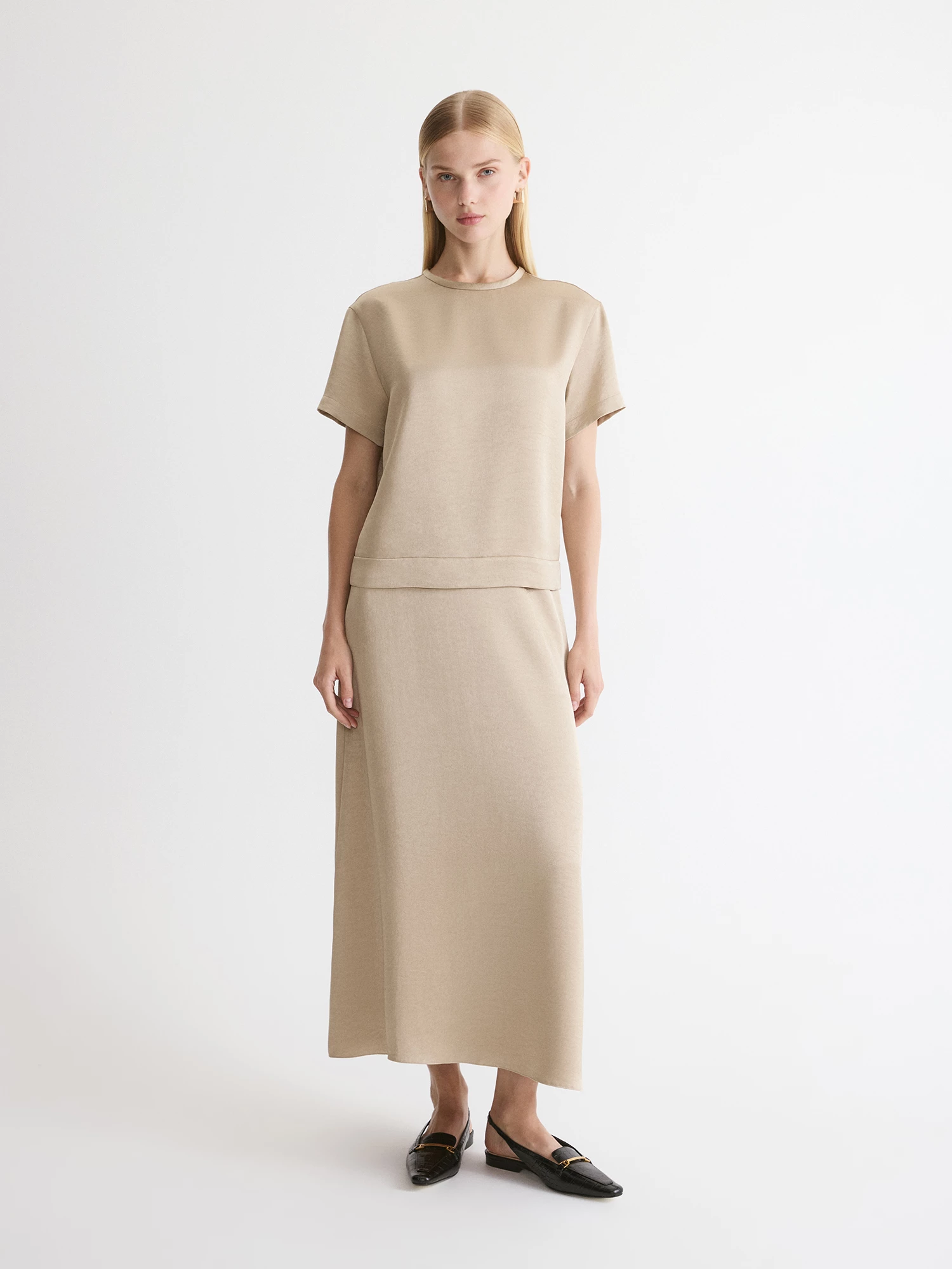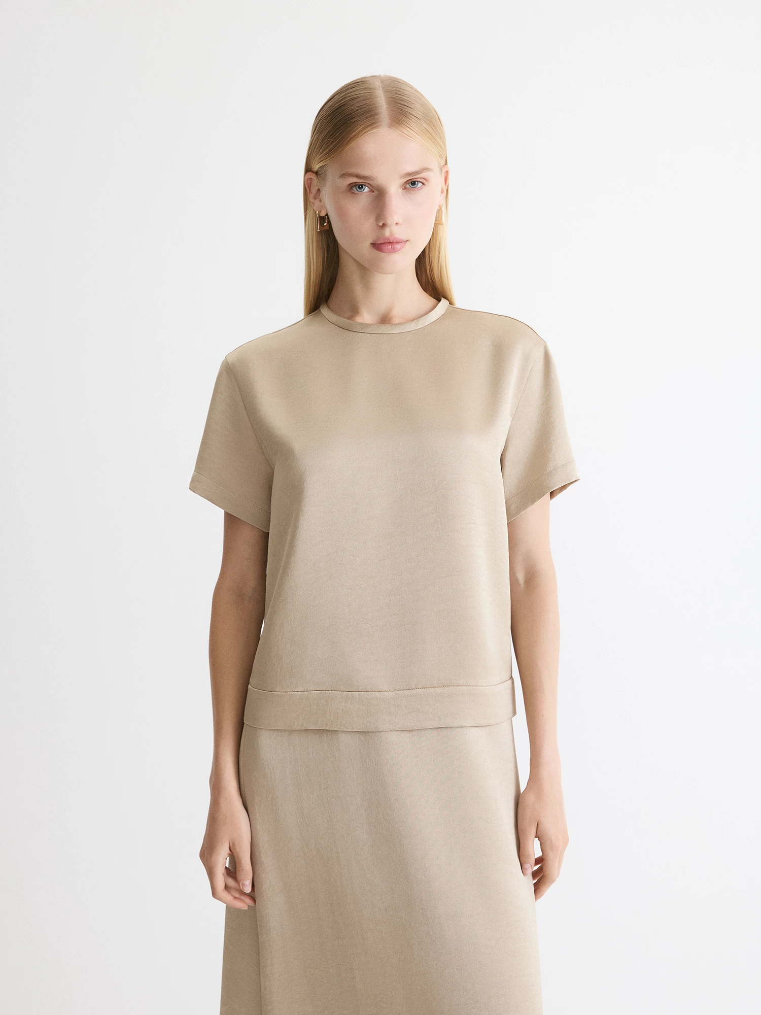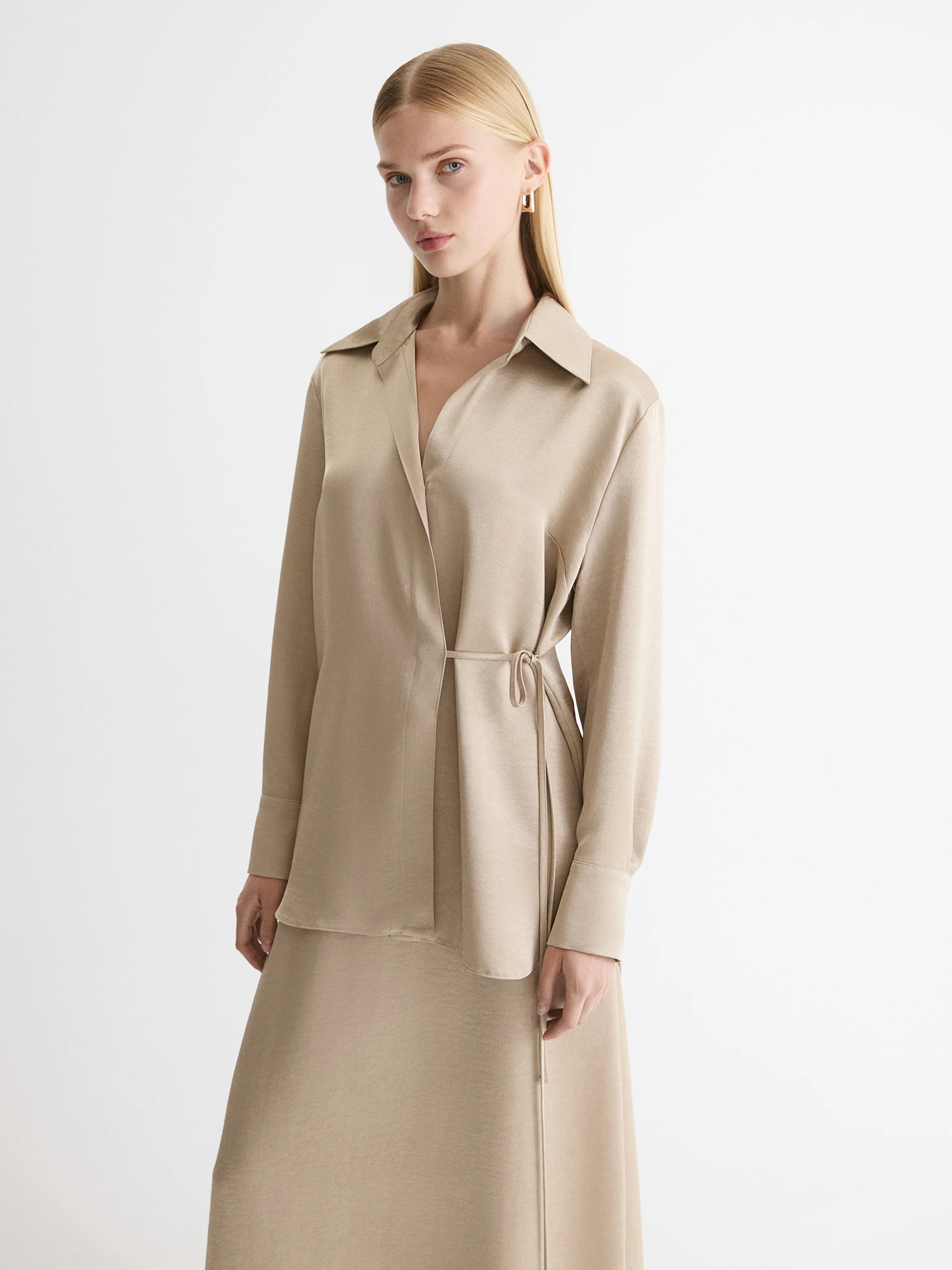 Выбрали для модели высокотехнологичный полиэстер с благородным золотым отливом и эффектом крэш. Такая жатая ткань не мнется, сохраняя форму весь день и не требуя особого ухода. Светло-бежевый с золотистым подтоном комплементарен к темным, светлым и ярким оттенкам.