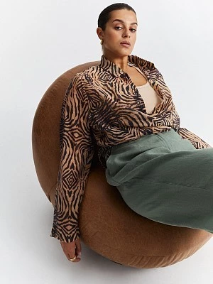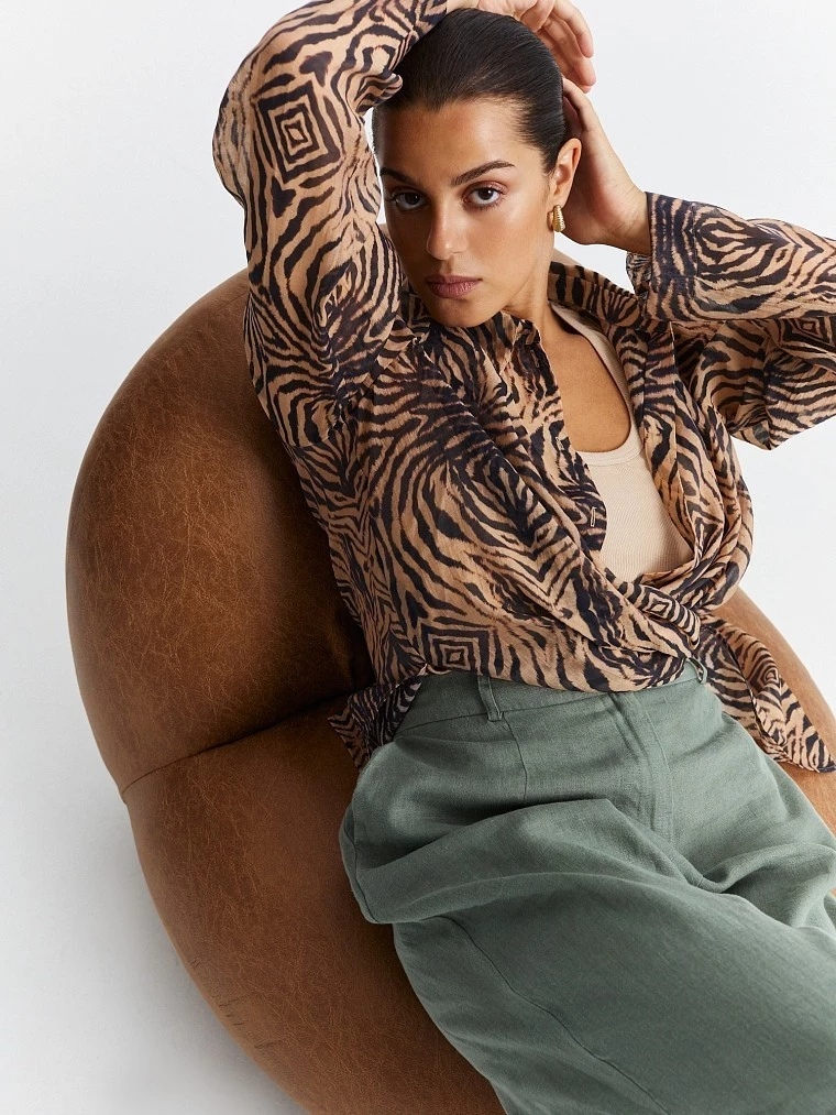 Блуза из вискозного шелка - отличное дополнение для вашего гардероба. В состав ткани входит модифицированная вискоза, которая производится из древесины эвкалипта, бамбука и сосны. Легкий, дышащий материал прост в уходе и практически не ощущается на теле. Благодаря свободному крою и комфортной длине модель прекрасно сидит по фигуре и скрывает недостатки. Трендовый анималистичный принт «зебра» в темно бежевом оттенке освежает повседневный образ, привлекает к себе внимание и добавляет образу изюминку. В сочетании с брюками или шортами из коллекции создаст комфортный образ на каждый день.