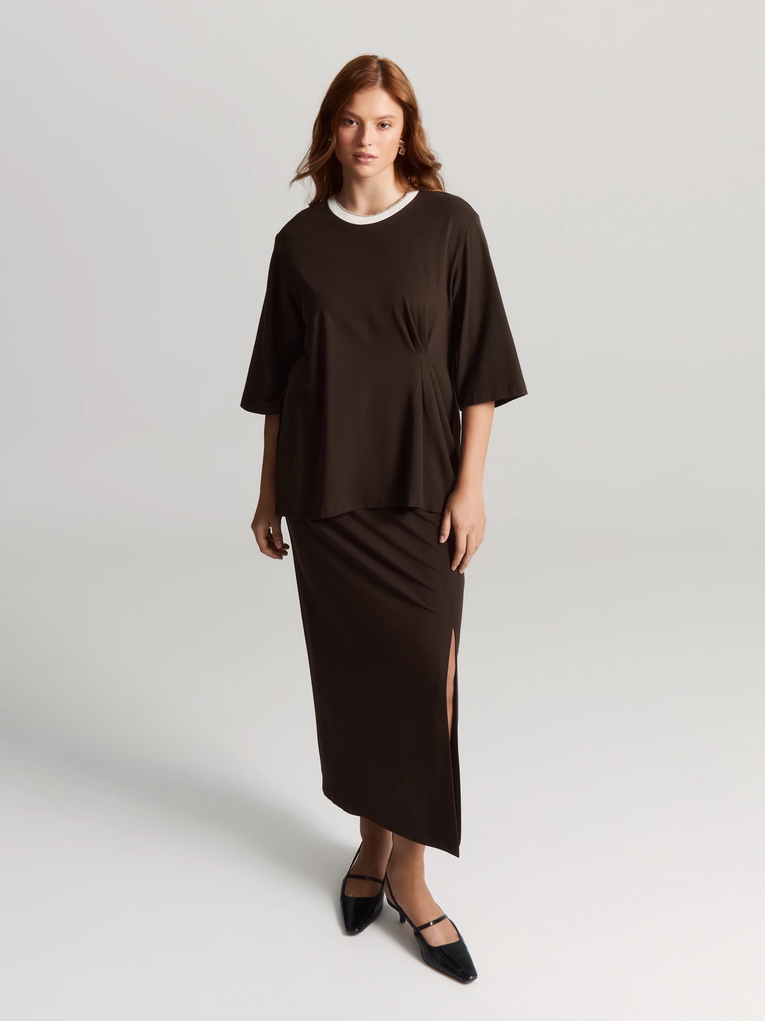 Блуза шоколадного оттенка с выраженным оливковым подтоном хорошо сочетается с джинсами, брюками и юбкой SK0618K5.