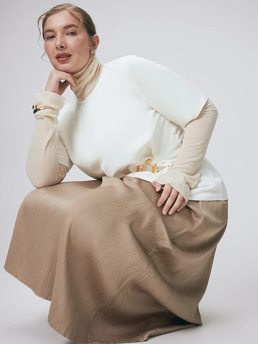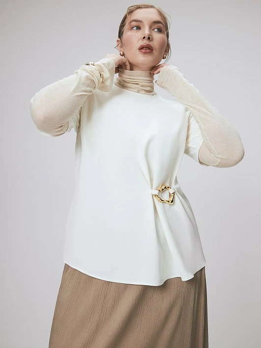 Создали блузку с аккуратным круглым вырезом и втачным коротким рукавом, лаконичным центральным швом по спинке для того, чтобы привлечь внимание к особой детали - асимметричной складке, образованной с помощью несъемной пряжки оригинальной формы. Правильная посадка изделия обеспечена: справа с помощью нагрудной вытачки, слева - с помощью той же асимметричной складки, как раз являющейся альтернативой вытачке. Модель выполнена из высокотехнологичного полиэстера турецкого производства - материала нового поколения с высоким тактильным качеством. Блуза в актуальном сливочном оттенке подойдет к костюмным брюкам и юбкам, а также к джинсам. Любое из этих сочетаний достойно завершит сумка-хобо и акцентные серьги.