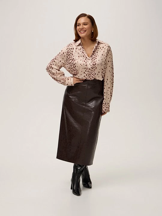 Блузка с элегантным V-образным вырезом и отложным воротником на отрезной стойке — воплощение утонченной классики и современного комфорта, созданное для ценителей безупречного стиля. Благородный отложной воротник придает образу строгую элегантность, в то время как V-образный вырез мягко подчеркивает линию шеи, создавая эффектную рамку для лица. Длинный втачной рукав с изящным манжетом на пуговицах добавляет образу собранности и завершенности, позволяя легко регулировать длину рукава для создания разных стилистических эффектов. Нагрудные вытачки обеспечивают идеальную посадку по фигуре, подчеркивая женственные изгибы, в то время как свободный прямой силуэт без застежки дарит непревзойденный комфорт и свободу движений. Шелковистая ткань с благородным атласным блеском, выгодно демонстрирующая эффектный принт, — это идеальное сочетание роскоши и практичности. Полиэстер обеспечивает износостойкость и сохранение безупречного внешнего вида, а добавление спандекса гарантирует идеальную посадку и комфорт при носке. Ткань невероятно приятна к телу, мягко струится по фигуре, создавая эффектные переливы света при движении, и требует минимального ухода, сохраняя свой безупречный вид в течение всего дня. Такая инвестиция в основу бесчисленных стильных комбинаций - воплощение уверенности, элегантности и безупречного вкуса.