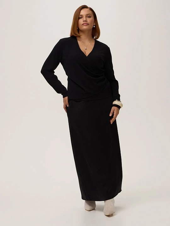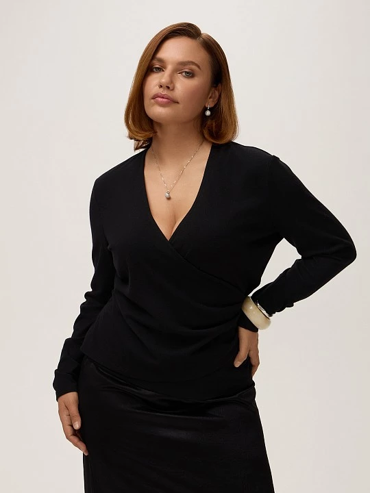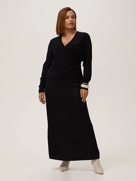 Блузка - сама элегантность, воплощенная в комфортном трикотаже с содержанием шерсти. V-образный вырез, образованный за счет запаха с фиксацией по боковым швам, мягко подчеркивает линию шеи и декольте, добавляя образу женственности и загадочности, а втачной длинный рукав обеспечивает безупречную посадку и свободу движений. Три складки, заложенные по боковому шву, — это не просто декоративный элемент, а необходимая деталь, которая добавляет силуэту динамику. Ткань из полиэстера, акрила, нейлона и овечьей шерсти — это идеальный баланс практичности и комфорта. Полиэстер и нейлон обеспечивают износостойкость и сохранение формы, акрил добавляет мягкость и теплоту, а овечья шерсть дарит уют и благородную фактуру. Глубокий черный цвет, насыщенный и благородный, придает образу изысканную строгость, делая блузу универсальной основой как для делового гардероба, так и для вечерних выходов.