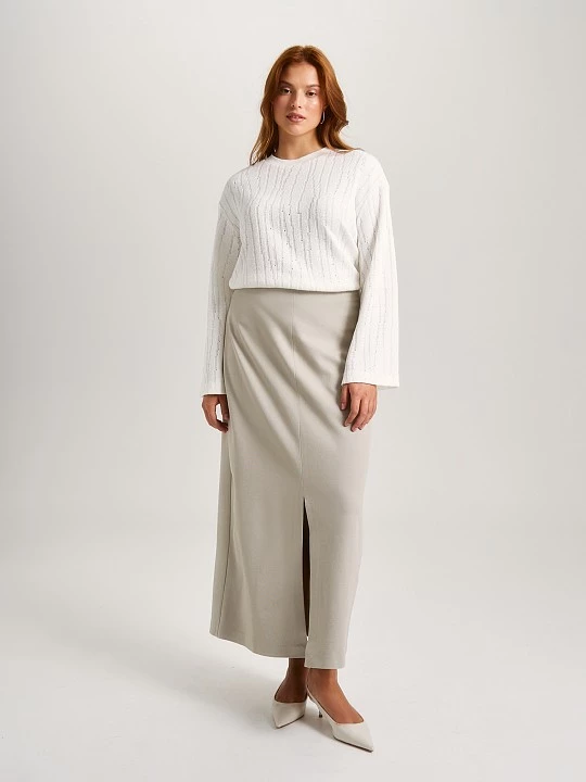 Блуза с аккуратным полуприлегающим силуэтом и минималистичным дизайном — это идеальный выбор для тех, кто ценит стиль и комфорт. Модель отличается небольшим круглым вырезом, который придает ей элегантный вид, и длинными втачными рукавами со спущенным плечом, что создает расслабленный и современный силуэт. Классический белый цвет блузы делает ее универсальной, позволяя легко сочетать с различными аксессуарами и элементами гардероба, что открывает широкие возможности для стилизации. Для изготовления блузы использован качественный смесовый трикотаж с эффектом вязаного ажурного полотна, который представлен в виде вертикальных ломаных линий. Этот прием не только добавляет текстурности, но и соединяет эстетику вязаного трикотажа с прочностью кроеного материала. Использование настоящего подвяза для бейки горловины, выполненного с помощью японской машины Shima Seiki, подчеркивает внимание к деталям и высокое качество исполнения. Смесовое полотно обладает множеством преимуществ: оно приятно на ощупь, не подвержено усадке, что гарантирует долговечность изделия, и имеет устойчивость к многократным стиркам. Кроме того, блуза отличается низкой сминаемостью, что делает ее идеальной для повседневной носки и путешествий. Эта модель станет отличным дополнением к любому гардеробу, позволяя создавать как повседневные, так и более формальные образы. Благодаря своему лаконичному дизайну и качественным материалам, блуза легко впишется в капсульный гардероб, обеспечивая стильный и комфортный вид в любых ситуациях.