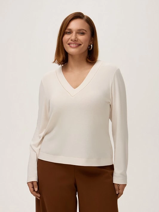 Блузка из мягкого кроеного трикотажа с эффектом ручной вязки — воплощение уютной элегантности и современного комфорта, созданное для тех, кто ценит в одежде гармонию природной мягкости и стильного дизайна. Нежный молочный цвет придает образу теплую изысканность, делая блузу универсальной основой как для повседневных ансамблей, так и для торжественных выходов. Эффект вязки придает трикотажу особую текстуру, создавая иллюзию только что связанного вручную изделия. Втачной длинный рукав обеспечивает идеальную посадку, мягко облегая руки, а V-образный вырез, отделанный золотистой тесьмой "мониль", становится изысканным акцентом, добавляющим образу ноту праздничного блеска. Прямой силуэт без вытачек создает лаконичный, но при этом женственный образ, который подчеркивает естественную красоту фигуры, не стесняя движений. Вискозный трикотаж — это идеальный баланс практичности и комфорта. Полиэстер обеспечивает износостойкость и сохранение формы, вискоза дарит невероятную мягкость и приятные тактильные ощущения, а спандекс добавляет эластичность, гарантируя идеальную посадку.