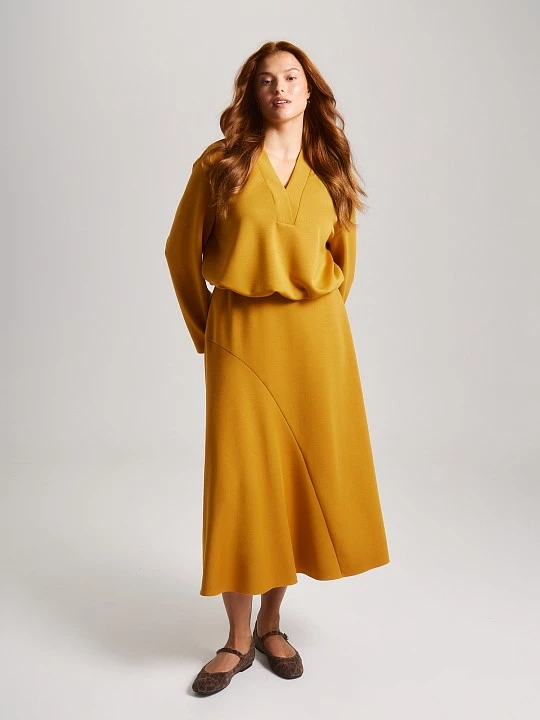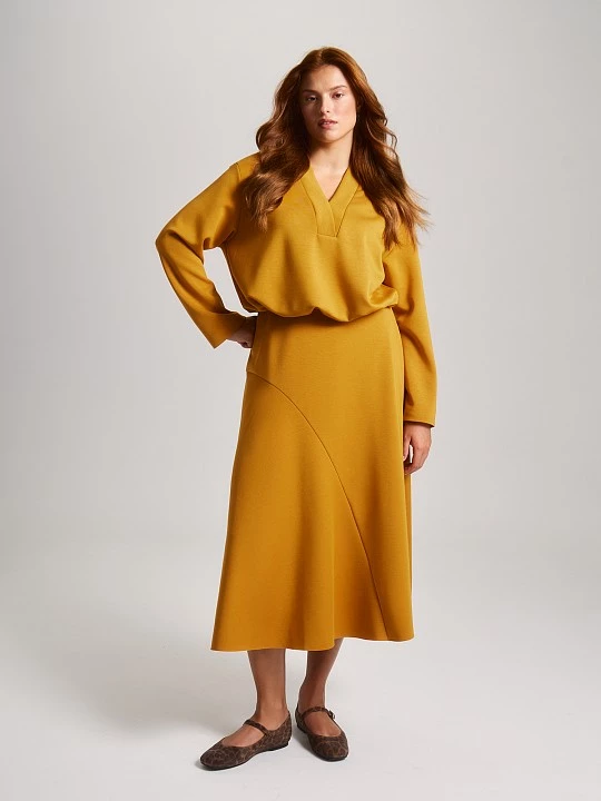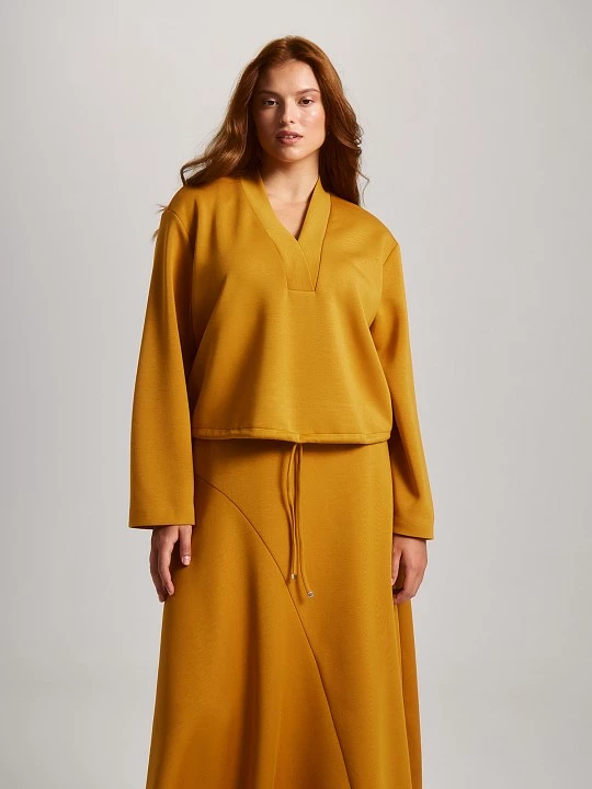 Блузка прямого силуэта со спущенным плечом — воплощение современной элегантности, где каждая деталь создана для вашего комфорта и стильного самовыражения. Свободный крой со спущенной линией плеча дарит непревзойденную легкость движений, создавая тот самый эффект непринужденной утонченности, который так ценится в современной моде. V-образный вырез с аккуратной бейкой мягко обрамляет зону декольте, добавляя образу женственности, в то время как кулиса по низу позволяет регулировать степень прилегания, создавая различные стилистические вариации — от свободного силуэта до более собранного варианта. Теплый природный тон оттенка "золото инков" оживляет образ благородными переливами, делая его по-настоящему уникальным. Ткань, состоящая из полиэстера, модала и спандекса, сочетает в себе лучшие качества волокон: прочность и износостойкость полиэстера, мягкость и дышащие свойства модала, а также идеальную эластичность, которую обеспечивает спандекс. Этот состав дарит коже невероятно приятные тактильные ощущения, сохраняя форму и практически не сминаясь. Блуза прекрасно сочетается с юбкой SK0568K, представляя собой готовое стилевое решение, которое дополнит как повседневные, так и более нарядные образы.