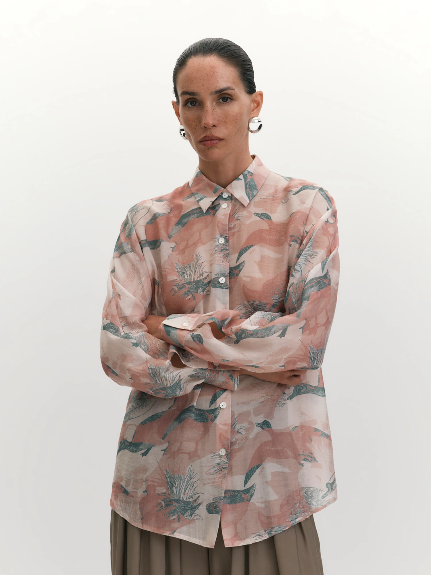 Блуза, где классический рубашечный крой встречается с романтичной легкостью вискозного полотна. Силуэт оверсайз создает актуальный свободный образ, а оригинальный принт в необычной розово-зеленой гамме, словно вдохновленный самой цветущей весной, делает его стильным и запоминающимся. Объемный рукав, мягко присобранный у манжеты, добавляет легкость и выразительность, подчеркивая романтику модели, а отложной воротник на отрезной стойке и центральная застежка на пуговицы привносят ноту аккуратности и элегантности, находясь в гармонии с мягкостью силуэта. Длина ниже середины бедра делает блузу универсальной, позволяя сочетать ее с самыми разными элементами гардероба, будь то джинсы, юбки или шорты. Сшитая из модифицированной вискозы с добавлением нейлона, она невероятно мягкая, гладкая и приятная к телу, при этом прочная, устойчивая к деформации и легкая в уходе. Блуза, являющаяся воплощением комфорта, демократичности и эстетики, идеальный выбор для каждого дня и случая.