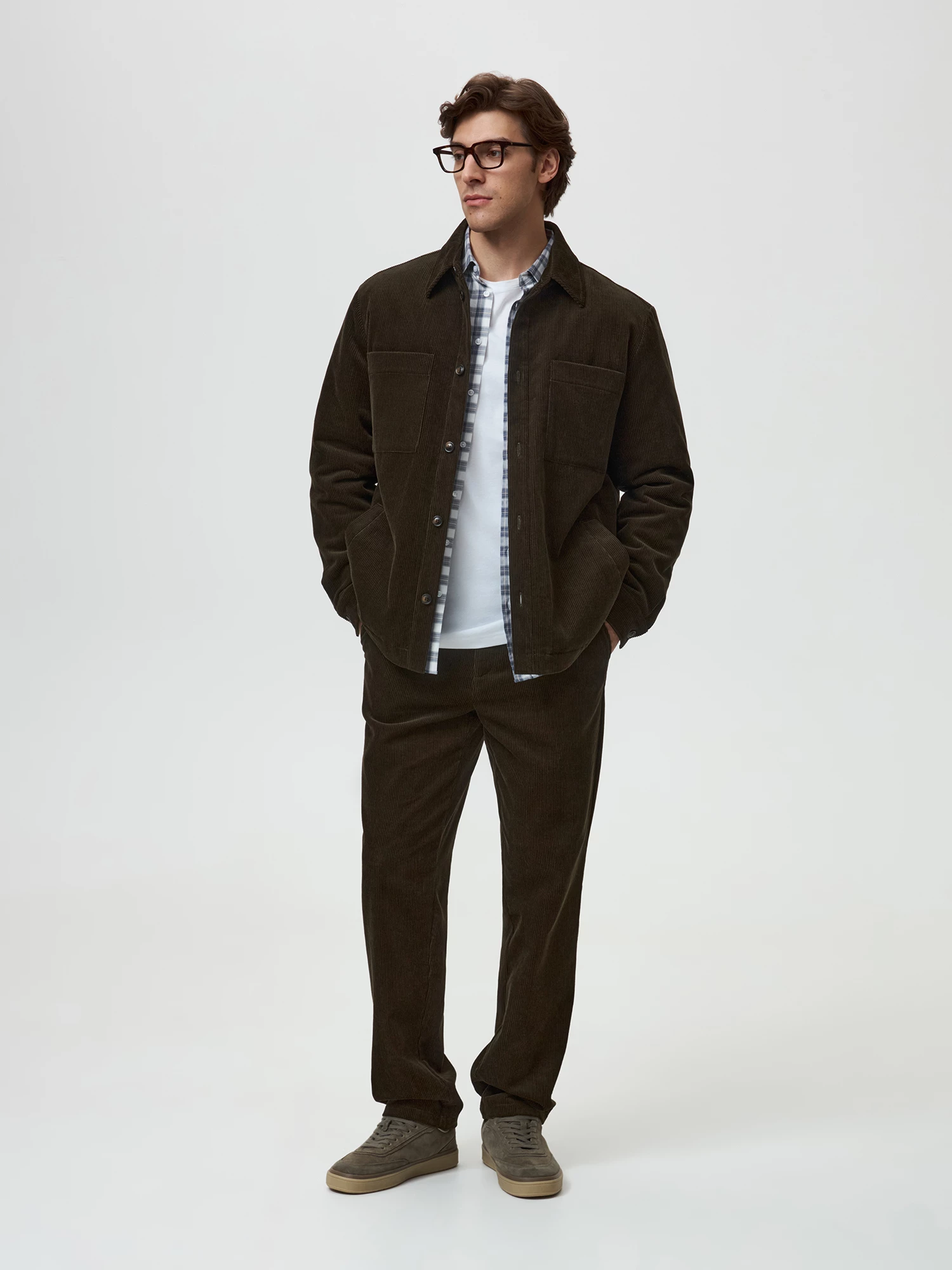 Новое прочтение базы - вельвет в осени. Выбрали для брюк свободного силуэта вельвет из 100% хлопка, гипоаллергенного, дышащего и тактильно приятного. Модель на притачном поясе со шлевками, с косыми боковыми карманами и задними карманами в рамку с фиксацией на пуговицу. Хорошая посадка по бедрам достигнута благодаря четырем талиевым вытачкам.