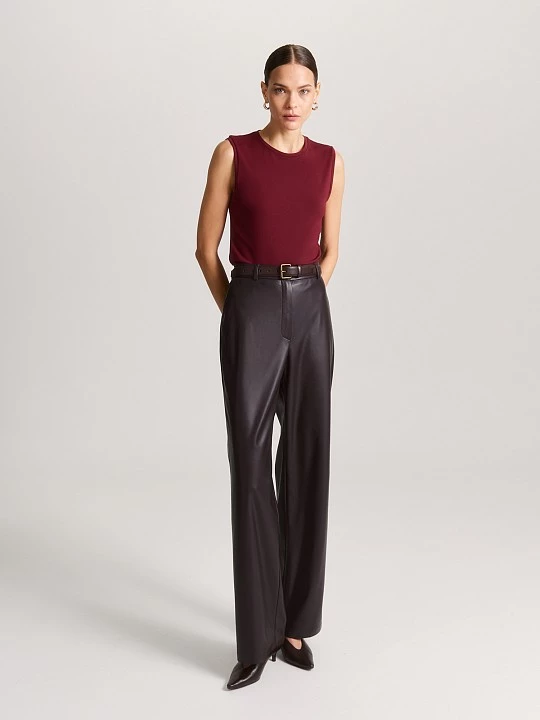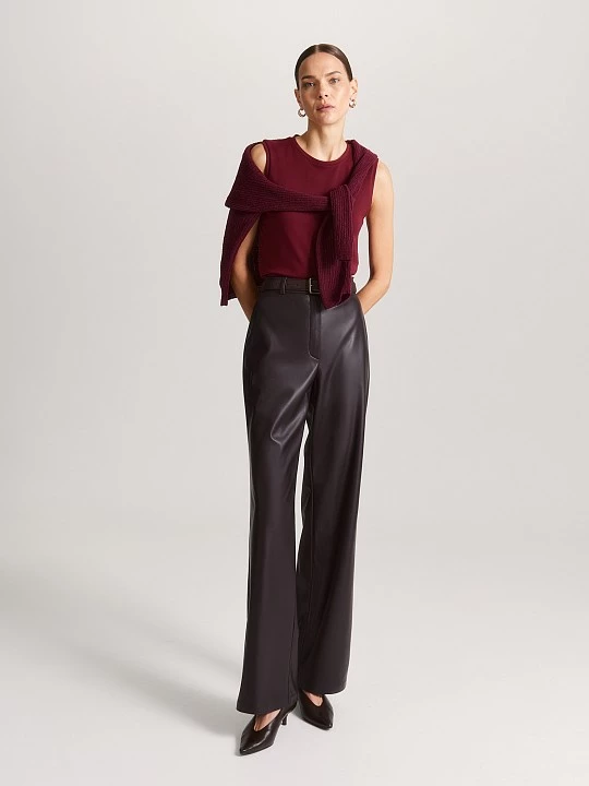Брюки сшиты из плотной, но мягкой экокожи шоколадного цвета с легким блеском. Такой материал хорошо держит форму и сохраняет тепло.