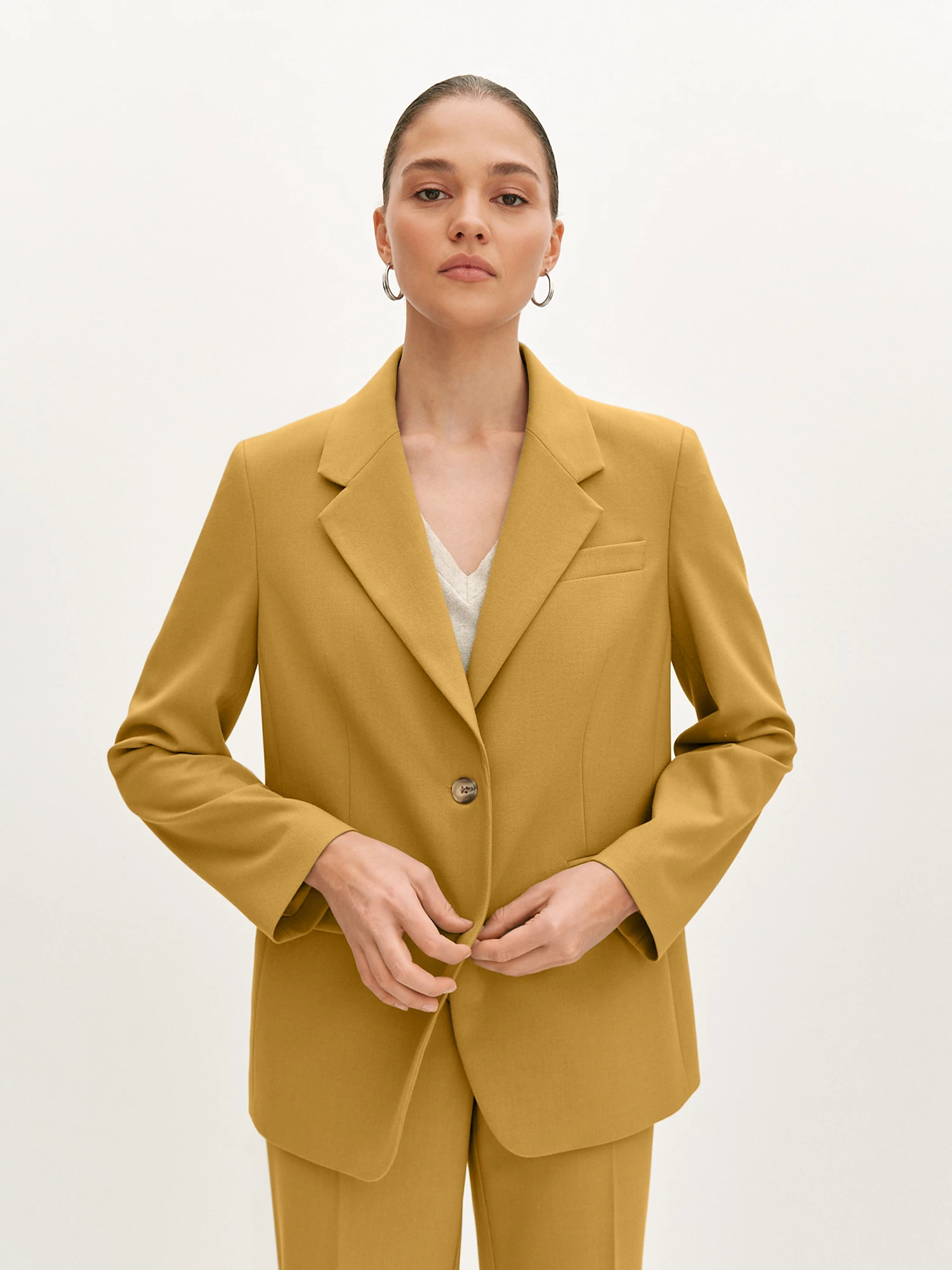 Классические брюки яркого горчичного оттенка со стрелками из эластичной поливискозы. Модель прямого силуэта, полной длины и застежкой на молнию и пуговицу. Пояс на резинке обеспечивает удобную посадку на талии. Брюки идеально сочетаются с различными блузами и топами, а с пиджаком из этой коллекции создадут классический деловой образ.