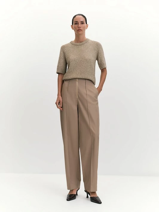 Брюки-слоучи — это стильный и комфортный элемент гардероба, который идеально подходит для создания как повседневных, так и более нарядных образов. Их уникальный крой с небольшим объемом в верхней части и легким заужением книзу обеспечивает свободу движений и при этом подчеркивает фигуру. Модель отличается удобными боковыми и декоративными задними карманами, что добавляет функциональности и стиля. Отсутствие притачного пояса создает аккуратный и современный вид, а застроченные складки, переходящие в стрелки, и талиевые вытачки обеспечивают лучшую посадку и вытягивают силуэт. Застежка на золотистую молнию спереди добавляет актуальный акцент, контрастирует с основным цветом ткани и придает модели завершенный вид. Брюки изготовлены из высококачественной смеси хлопка, модифицированной вискозы и спандекса, что обеспечивает отличную воздухопроницаемость, мягкость и эластичность. Такой состав делает модель приятной на ощупь и комфортной в носке, а также позволяет сохранять форму даже после многократных стирок. Брюки-бананы в золотисто-бежевом цвете станут акцентной и востребованной деталью гардеробной капсулы.