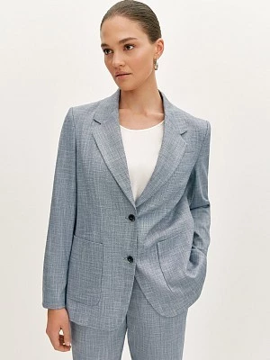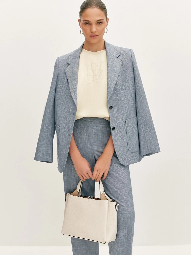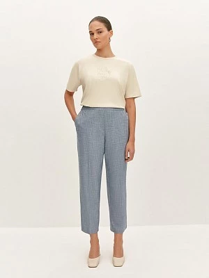 Лаконичные бело-синие брюки из вискозного материала с неповторимой льняной текстурой очень лёгкие и комфортные. Модель прямого кроя с притачным поясом и боковыми карманами. Эластичная резинка в поясе обеспечивает комфортную посадку, а вертикальные стрелки вытягивают силуэт. Брюки идеально сочетаются с жакетом из той же коллекции, создавая однотонный образ.