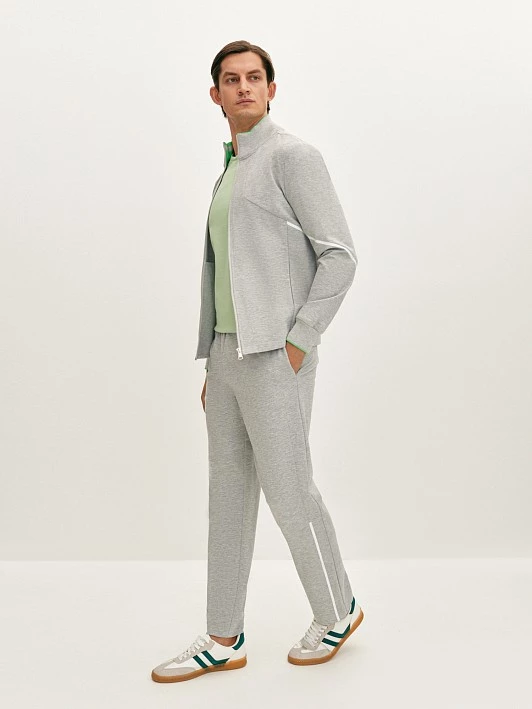 Спортивные брюки светло-серого цвета прямого силуэта. Серый цвет является универсальным и подойдет для расслабленных и спортивных образов. Модель из гладкого и прочного вискозного трикотажа, поясом на резинке и внутренним шнуром обеспечивает комфортную посадку. Брюки дополнены декоративными подрезами и белыми элементами по низу. Для создания спортивного образа рекомендуем сочетать с легкой толстовкой из коллекции.