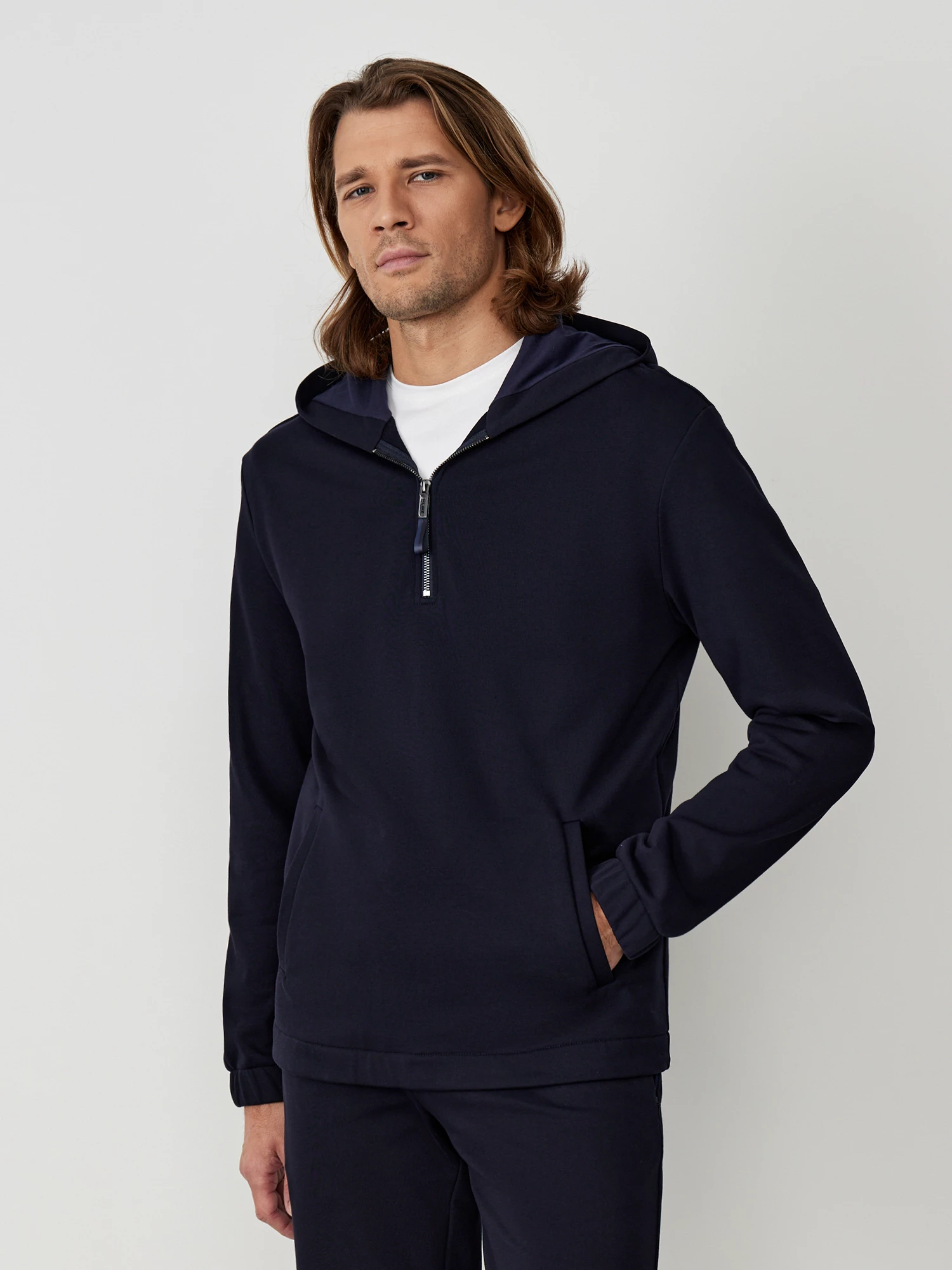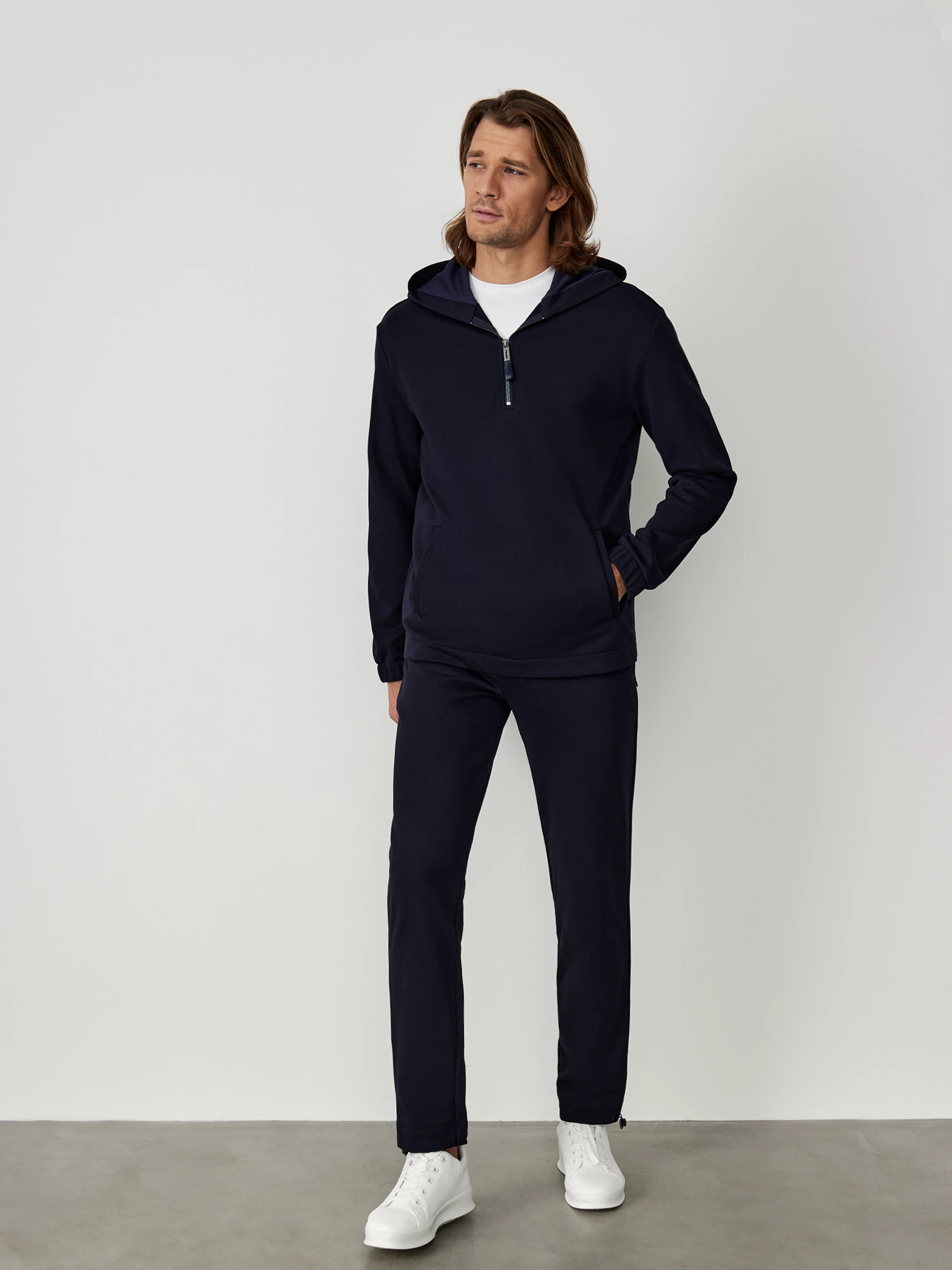 Стильные спортивные брюки из мягкого хлопкового трикотажа универсального темно-синего цвета. Модель комфортного прямого кроя, с эластичным поясом на резинке и завязках, двумя прорезными карманами в боковых швах с потайной тесьмой-молнией и одним накладным карманом сзади. Дизайнерское решение - по низу брючины кулиска, которую можно затянуть, благодаря этому брюки легко трансформируются в джоггеры. Сочетаются в качестве костюма с толстовкой из той же коллекции, а также с базовыми однотонными майками и спортивной обувью.