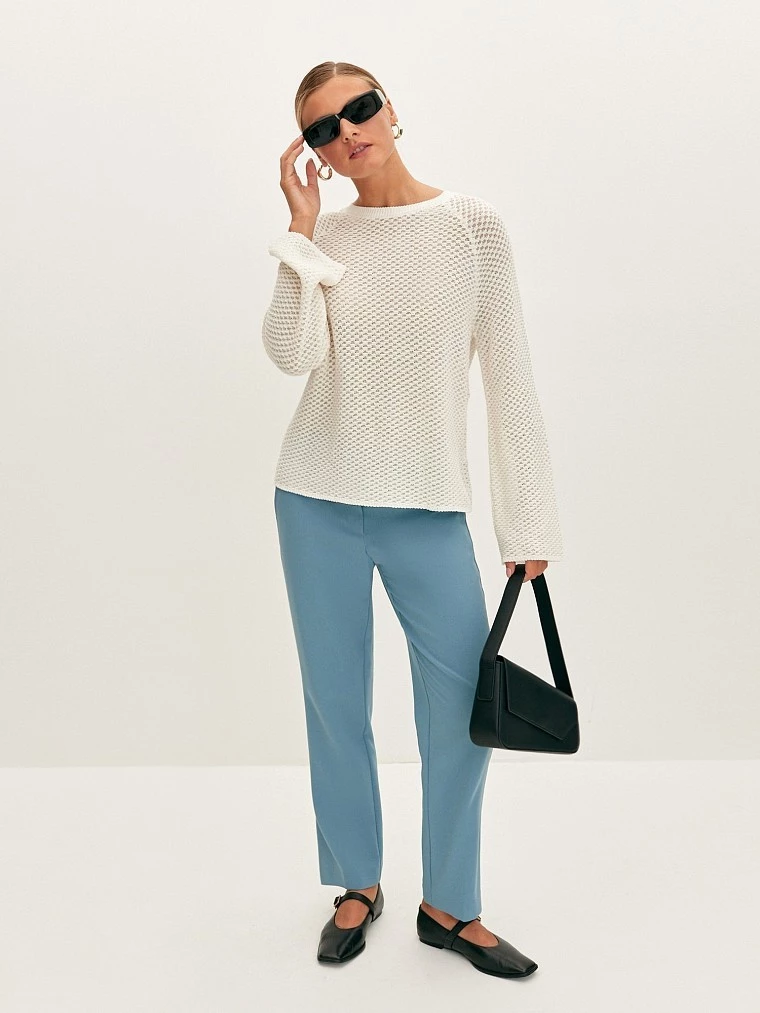 При изготовлении молочного джемпера ажурной вязки использовали итальянскую пряжу на основе органического хлопка, которая в жаркую погоду создает ощущение прохлады и комфорта, а фирменная техника эластичной вязки обеспечивает комфортную посадку на любой тип фигуры. Модель прямого силуэта, среднего объема, с круглой горловиной и свободным, расширенным к низу рукавом реглан обеспечит комфорт и отлично впишется в базовый гардероб.