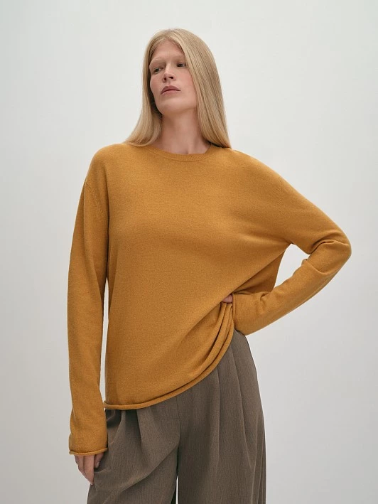 Тонкий базовый прямого силуэта джемпер с круглой горловиной и длинными рукавами. Модель отличается оригинальным дизайнерским приемом – край рукава и низ самого изделия слегка закручиваются, этот прием использован в поддержку свободного силуэта изделия. Выбрали для теплого свитера нежнейший кашемир родом из Внутренней Монголии (Внутренняя Монголия - регион Китая, славящийся высоким качеством кашемира). У тонкого пуха горных коз малая распространенность и высокая цена, пряжа из него отличается прочностью и износостойкостью. Натуральный кашемир никогда не блестит, имеет матовую поверхность. Процесс вязки происходит на японской плосковязальной машине Shima Seiki. Цельновязаная основа брендового вязаного джемпера Elis соединена вручную на кеттельном оборудовании с бейкой горловины. Это премиальная, дорогая обработка, позволяющая создавать эластичное, практически незаметное соединение. Теплый, однотонный, в насыщенном желтом, джемпер подойдет для деловой встречи, офиса, школы, прогулки, встречи с друзьями.