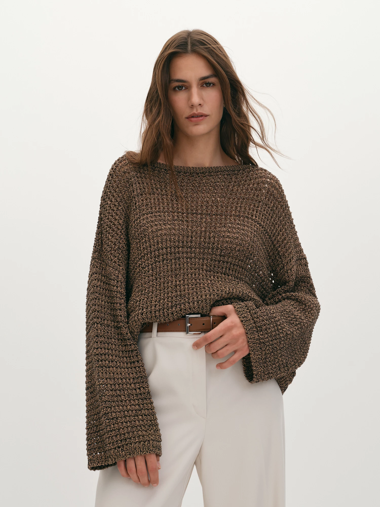 Джемпер-сетка, выполненный из фантазийной пряжи итальянского производства, представляет собой яркий пример современного вязаного искусства. Основой для этой модели послужила уникальная пряжа, состоящая из натурального хлопка и полиэстера. Хлопок обеспечивает мягкость и комфорт, в то время как полиэстер придаёт изделию износостойкость и прочность, что делает джемпер идеальным для повседневного использования. Фантазийная пряжа коричневого цвета с черной оплеткой создает выразительный визуальный эффект, который привлекает внимание и добавляет оригинальности. Это сочетание цветов и текстур, дополненное ажурной вязкой, позволяет создать эффектный джемпер-сетку с переливами цвета, который будет прекрасно смотреться как в повседневной, так и в более нарядной обстановке. Джемпер имеет горловину-лодочку, что подчеркивает линию шеи и придаёт образу женственность. Низ изделия и манжеты связаны резинкой, что обеспечивает удобство и комфорт при носке, а также помогает сохранить форму изделия. Все детали джемпера были вывязаны точно по лекалу на японской плосковязальной машине Shima Seiki, что гарантирует высокое качество и долговечность. Использование этой технологии позволяет достичь идеальной точности в вязании, что особенно важно для создания сложных узоров и текстур. Соединительные швы выполнены на кеттельном оборудовании, что является признаком премиального подхода к производству. Эта дорогая обработка обеспечивает эластичное и практически незаметное соединение, что делает джемпер ещё более комфортным в носке и не стесняет движений. Таким образом, джемпер-сетка из фантазийной пряжи не только отражает актуальные модные тренды, но и является универсальным элементом гардероба, который легко комбинируется с различными предметами одежды. Он станет отличным выбором для создания стильных образов, добавляя в них нотку оригинальности и утонченности.