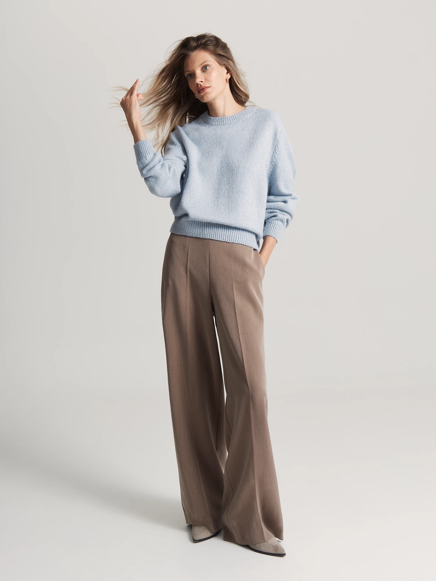 Фантазийная пряжа в нежно-голубом цвете с включениями золота придает мерцающий эффект, а использование высокоточного оборудования гарантирует качество исполнения. Особые эластичные швы делают джемпер невероятно комфортным и уютным.