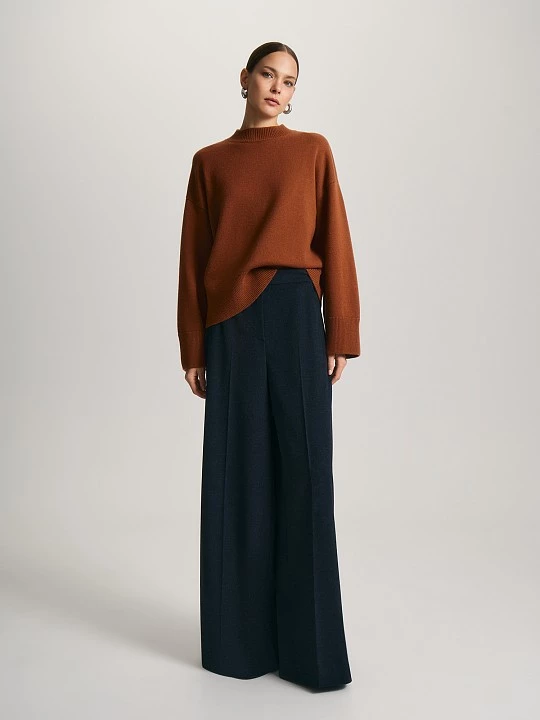 Джемпер увеличенного объема связан из мягкой шерсти мериноса. Он хорошо сохраняет тепло, отлично тянется и совсем не колется.