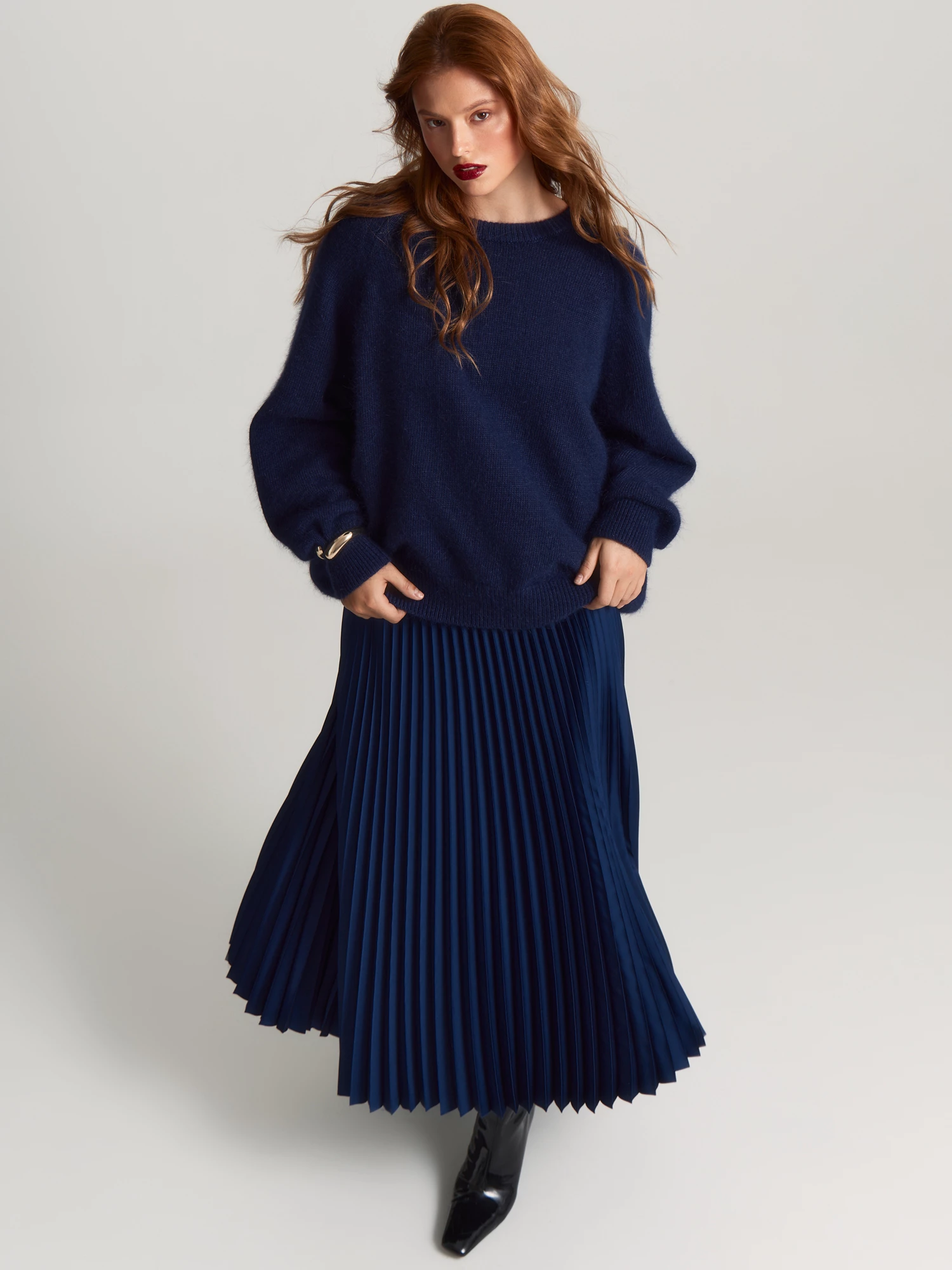Джемпер в таинственном темно-синем прекрасно сочетается с юбкой SK0591 и подойдет для деловой встречи, офиса, прогулки.