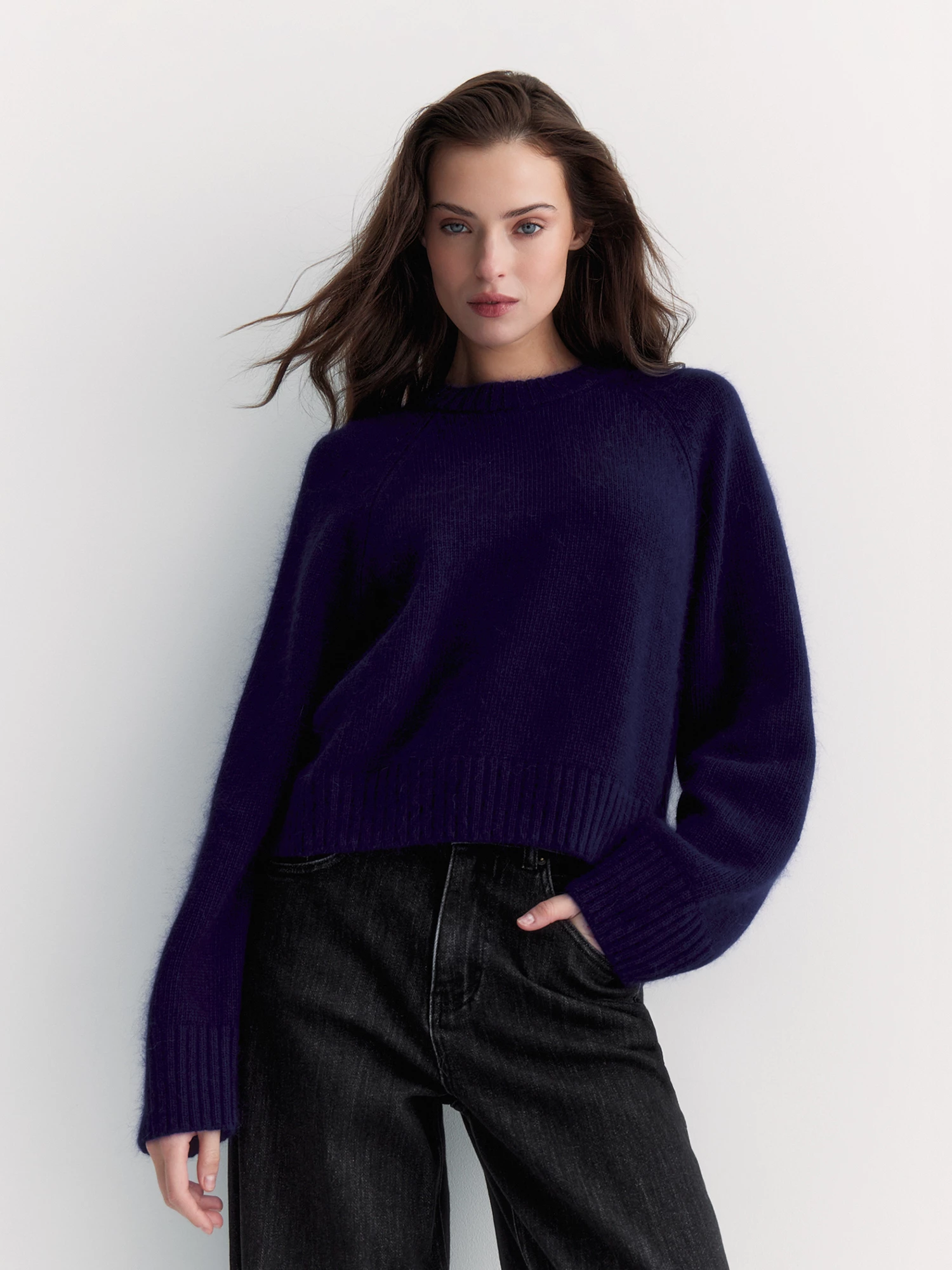 Укороченный джемпер аккуратного силуэта связан из нежной пряжи с ангорой и овечьей шерстью. Он очень мягкий, тёплый, с хорошей терморегуляцией. Выполнили модель с круглой горловиной и рукавом-реглан - удобно сидит и не сковывает движения.