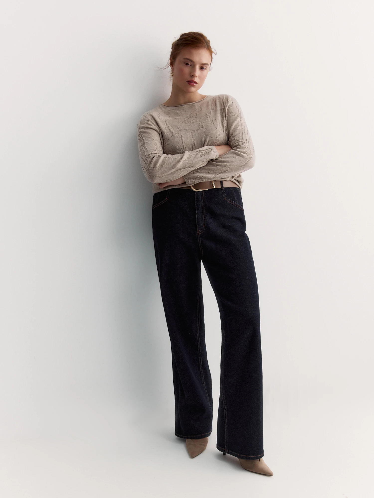 Прямой силуэт и длинные рукава делают джемпер универсальным: его можно носить с юбками, брюками или джинсами. Удобный крой не сковывает движения, а благородный узор добавляет образу ненавязчивую элегантность.
