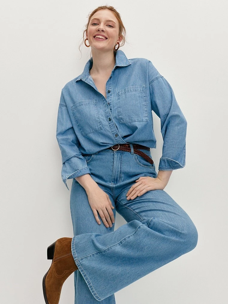 Джинсы-палаццо голубого оттенка выполнены из фирменного хлопкового денима. Модель с притачным поясом со шлёвками под ремень, боковыми карманами спереди и накладными американскими сзади. Прямой силуэт и небольшое расклешение от бедра обеспечивает комфорт и свободу движений. Джинсы голубого цвета стали основой современного гардероба. Они прекрасно сочетаются с футболками, блузками, джемперами и рубашками.