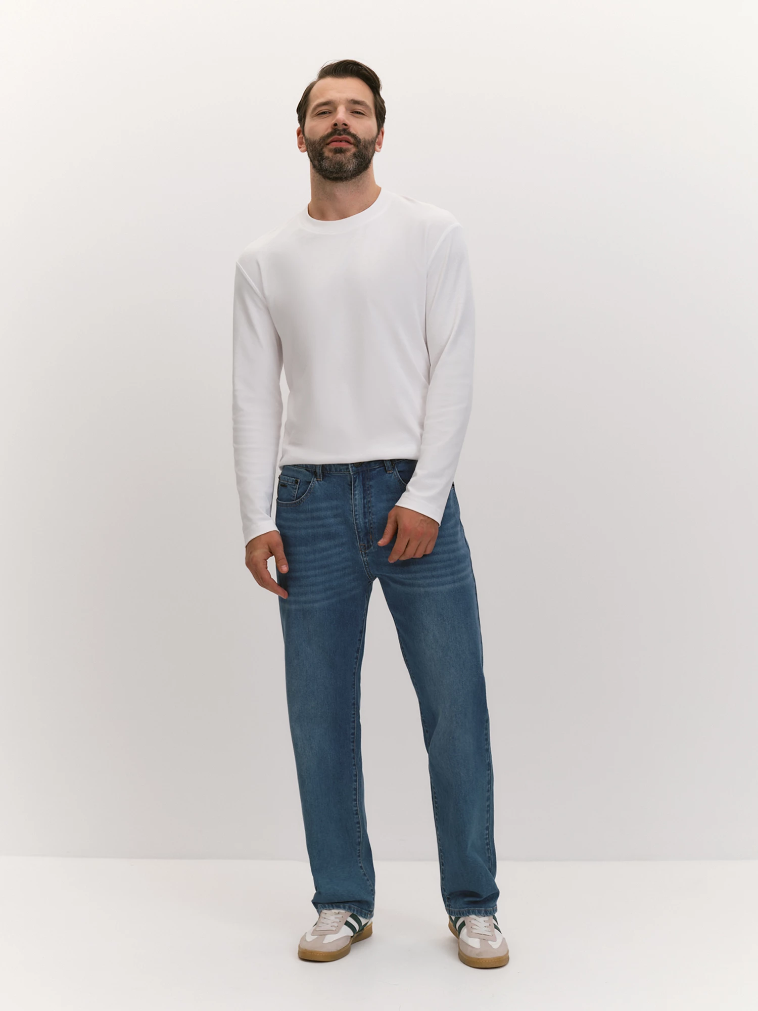 Джинсы-пятикарманники силуэта regular — это классическая модель стандартной средней ширины, идеальный выбор для повседневной носки и неформальных мероприятий. Джинсы выполнены из хлопкового денима с добавлением эластана. Хлопок обеспечивает натуральность, воздухопроницаемость и комфорт, а эластан придает ткани пластичность и формоустойчивость, улучшая посадку и обеспечивая свободу движений. Это делает джинсы удобными для повседневной носки и активного образа жизни. Светло-синий цвет джинсов универсален и освежает образ. Пять карманов добавляют функциональности, позволяя удобно хранить мелкие предметы. Брендированный патч на поясе и фирменная нашивка на маленьком кармане подчеркивают принадлежность к бренду и добавляют стильный акцент. Легкие потертости создают эффект винтажности, добавляют джинсам стиль и уникальность, создавая впечатление, что они имеют свою историю. Это придает образу легкость и неформальность, делая джинсы идеальными для создания расслабленных и модных луков. Такой деним — идеальное сочетание стиля, функциональности и комфорта.