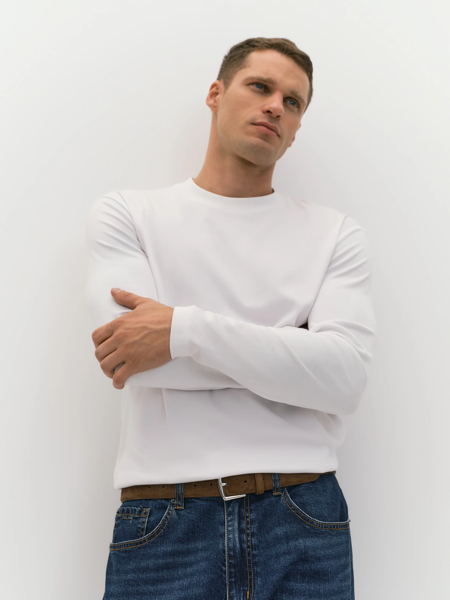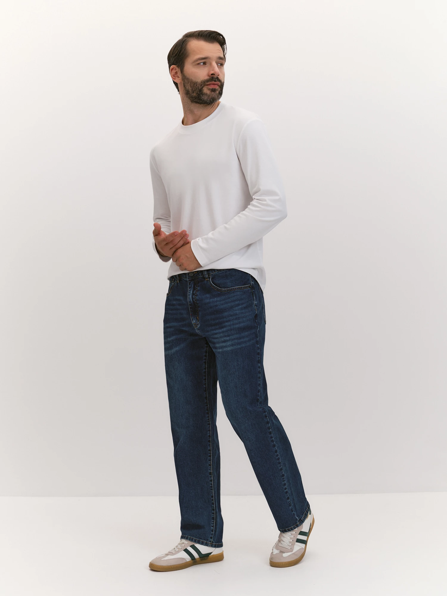 Джинсы-пятикарманники силуэта regular — это классическая модель стандартной средней ширины, идеальный выбор для повседневной носки и неформальных мероприятий. Джинсы выполнены из хлопкового денима с добавлением эластана. Хлопок обеспечивает натуральность, воздухопроницаемость и комфорт, а эластан придает ткани пластичность и формоустойчивость, улучшая посадку и обеспечивая свободу движений. Это делает джинсы удобными для повседневной носки и активного образа жизни. Синий цвет создает строгий и классический образ. Пять карманов добавляют функциональности, позволяя удобно хранить мелкие предметы. Брендированный патч на поясе и фирменная нашивка на маленьком кармане подчеркивают принадлежность к бренду и добавляют стильный акцент. Легкие потертости создают эффект винтажности, добавляют джинсам стиль и уникальность, создавая впечатление, что они имеют свою историю. Это придает образу легкость и неформальность, делая джинсы идеальными для создания расслабленных и модных луков. Такой деним — идеальное сочетание стиля, функциональности и комфорта.