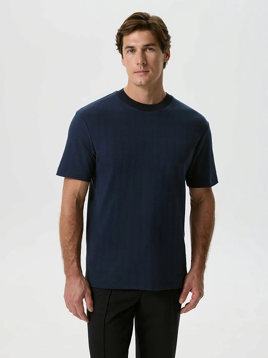 Футболка силуэта regular выполнена из уникальной турецкой фактурной ткани, состоящей на 100% из хлопка. Модель изготовлена из высококачественного хлопка, который обеспечивает отличную воздухопроницаемость и мягкость на ощупь. Особенность данной ткани заключается в её фактуре: переплетение нитей формирует рисунок, напоминающий классическую клетку, что придаёт изделию оригинальный и современный вид. Такой дизайн позволяет легко сочетать футболку с различными предметами гардероба, будь то джинсы, шорты или брюки. Аккуратный круглый вырез декорирован подвязом в тон основной ткани, выполненным на японской плосковязальной машине Shima Seiki. Эта технология обеспечивает идеальную посадку и долговечность изделия. Подвяз из хлопковой пряжи в тон основному темно-синему цвету характеризуется 12-м классом вязки, что говорит о высоком качестве и прочности материала. Такой уровень обработки возможен благодаря полному циклу собственного производства, что гарантирует контроль на каждом этапе создания футболки. Эта футболка не только стильная, но и практичная. Она отлично подходит для повседневной носки, активного отдыха или встреч с друзьями. Вы можете легко комбинировать её с различными стилями одежды, создавая как непринужденные, так и более элегантные образы. Выбирая эту футболку, Вы получаете качественный и комфортный элемент гардероба, который будет радовать Вас своим внешним видом и долговечностью на протяжении долгого времени. Это идеальный выбор для современных мужчин, стремящихся к удобству и стилю в повседневной жизни.