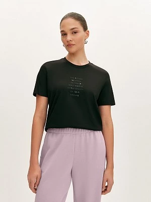 Лёгкая футболка чёрного цвета с авторским принтом выполнена из нежного премиального хлопка. Дышащий материал приятно ощущается на теле и обеспечивает комфорт в теплую погоду. Модель прямого силуэта с коротким втачным рукавом и круглым вырезом горловины, обработанным бейкой. Универсальную футболку легко сочетать со спортивными брюками или джинсами.