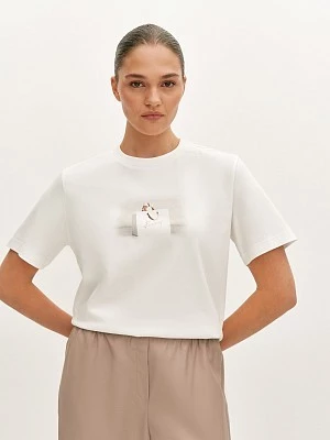 Повседневная белая футболка с коротким втачным рукавом и круглой горловиной декорирована дизайнерским принтом. Натуральный хлопковый трикотаж приятен к телу и поддерживает оптимальную температуру тела. Модель дополнит образ в стиле smart casual, а прямой силуэт обеспечит комфортную, не сковывающую движения посадку.