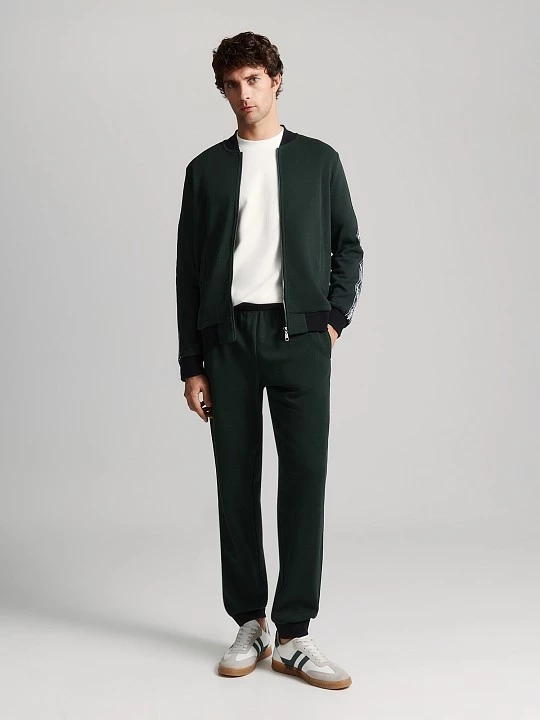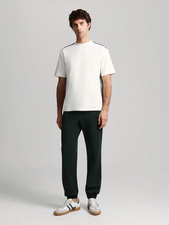 Выбрали для футболки трикотаж-пике хорошей плотности в молочном цвете. Хлопковый трикотаж "пике" – это воплощение элегантной практичности и удобства, где каждая петля создана для безупречного внешнего вида и невероятного комфорта. Этот удивительный материал сочетает в себе лучшие качества натурального хлопка с особой структурой переплетения, делающей его универсальным решением для любого времени года. Пике легко узнать – благодаря особому переплетению нитей, на лицевой стороне изделия Вы можете увидеть рисунок, напоминающий соты. У такого трикотажа высокие эксплуатационные характеристики – он прочный, износостойкий, очень хорошо пропускает воздух и впитывает влагу за счет высокого содержания хлопка. Футболка силуэта regular выполнена с круглым вырезом с отделкой из хлопкового трикотажа «рибана» и коротким рукавом со спущенным плечом. Акцентные брендированные лампасы придают силуэту четкость и связывают модель с темно-зеленым костюмом для спорта и отдыха. Лампасы созданы специально для трех моделей комплекта в актуальном для коллекции оттенке «платан». Такая футболка — стильный и практичный элемент гардероба, который станет отличным дополнением к любому образу. Комфортный крой и универсальный дизайн делают ее идеальным выбором для мужчин, стремящихся к сочетанию стиля и удобства в повседневной жизни.