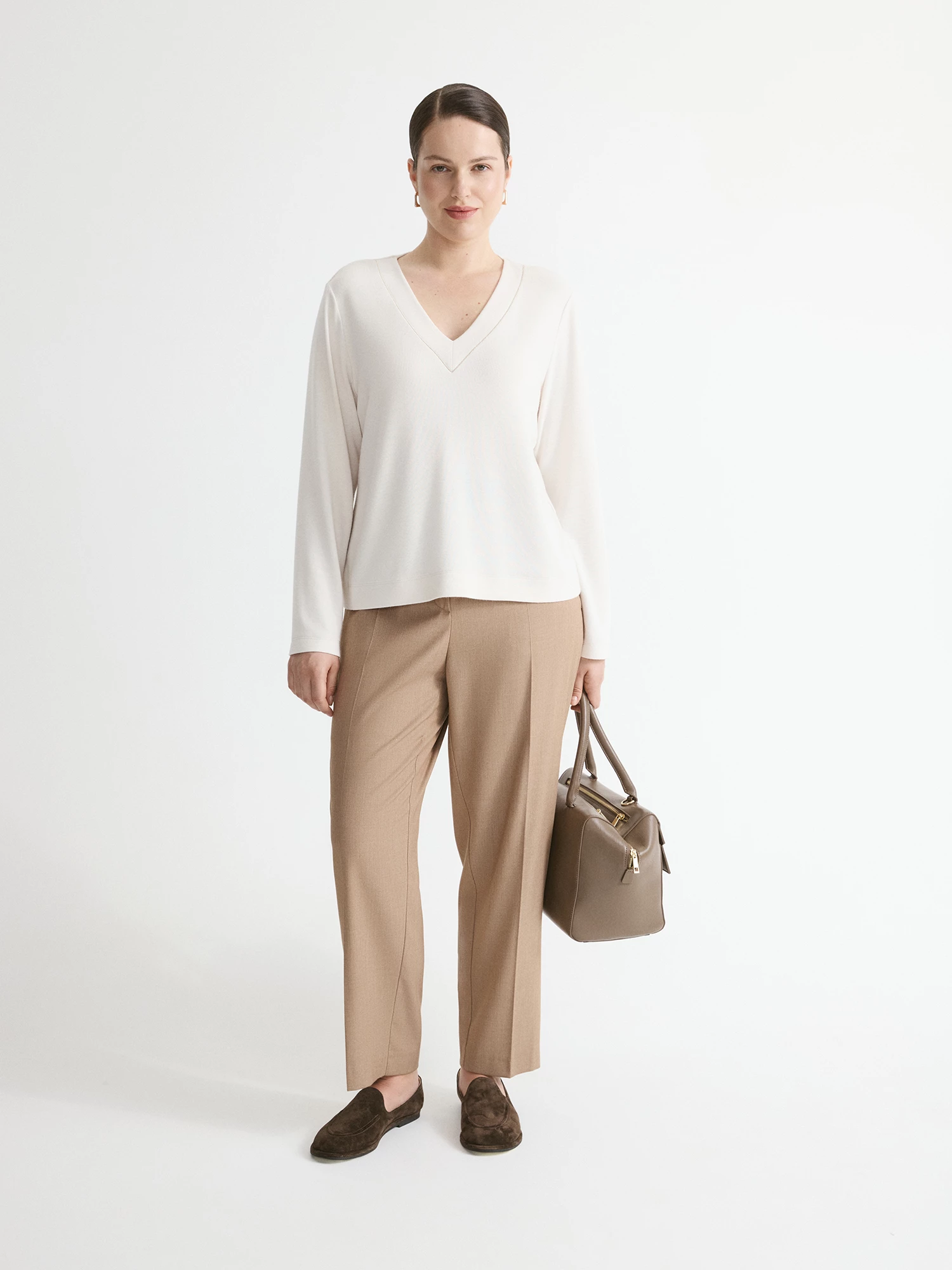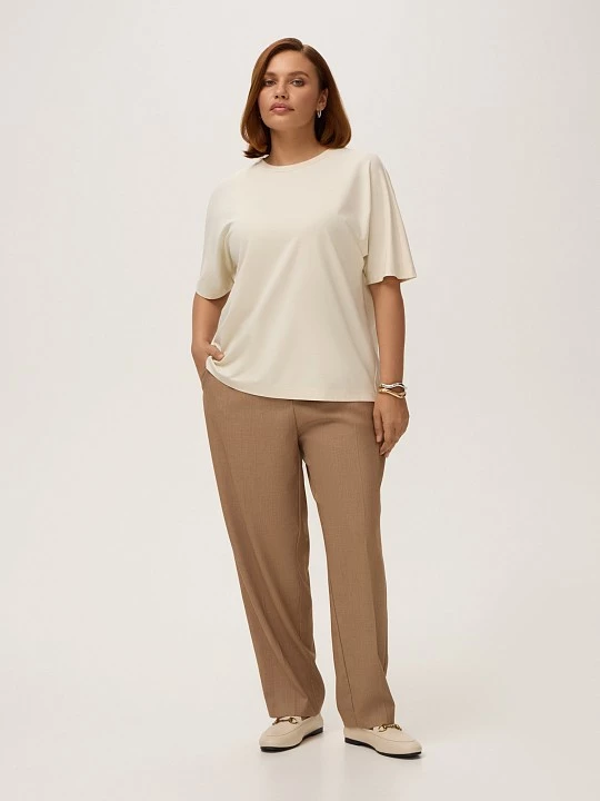 Футболка прямого кроя с коротким рукавом выполнена из гладкого эластичного вискозного трикотажа, поддерживающего хорошую циркуляцию воздуха. Актуальная длина изделия с закругленным низом позволяет носить футболку как навыпуск, так и в заправленном виде, благодаря чему она идеально впишется в повседневный гардероб. Если подобрать размер на один-два больше обычного, можно сформировать силуэт оверсайз, он предполагает ношение вещей большого размера, это удобно и стильно. Футболка в базовом оттенке "канноли крем" будет прекрасным дополнением к джинсам и брюкам из коллекции, а также под пиджак.