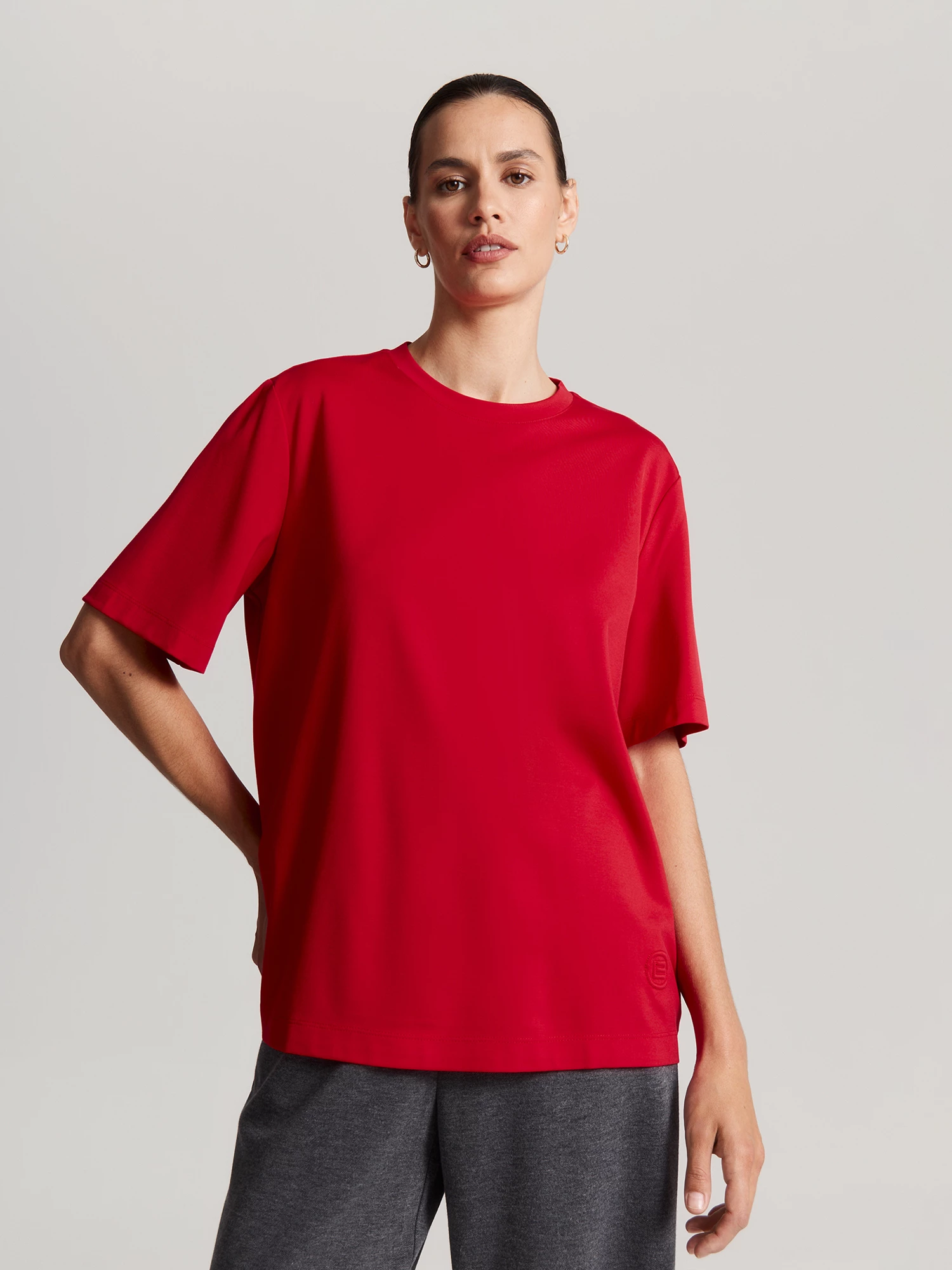 Фирменная вышивка добавляет визуальный интерес, а активный красный цвет делает футболку ярким акцентом.