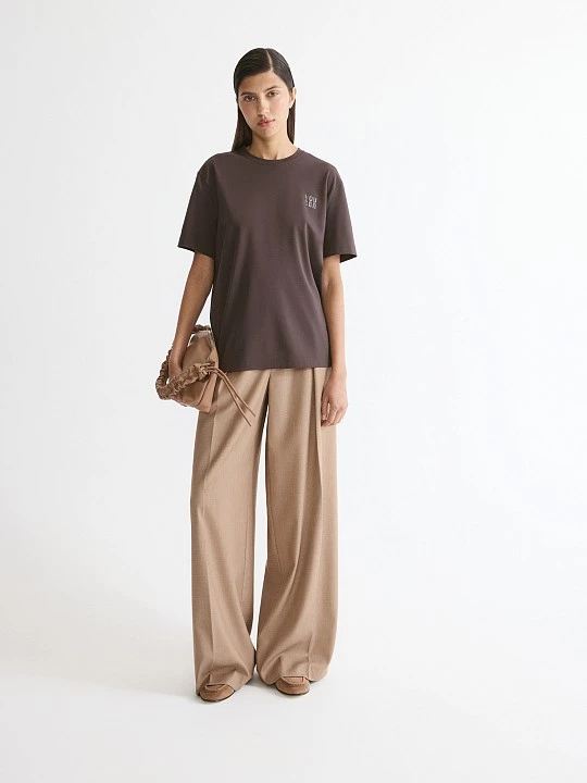Благородный и актуальный коричневый оттенок - отличная база для принта с характером, выполненного с помощью специального оборудования для печати по ткани на собственном производстве полного цикла. Выполнили модель из тактильно приятного вискозного трикотажа.