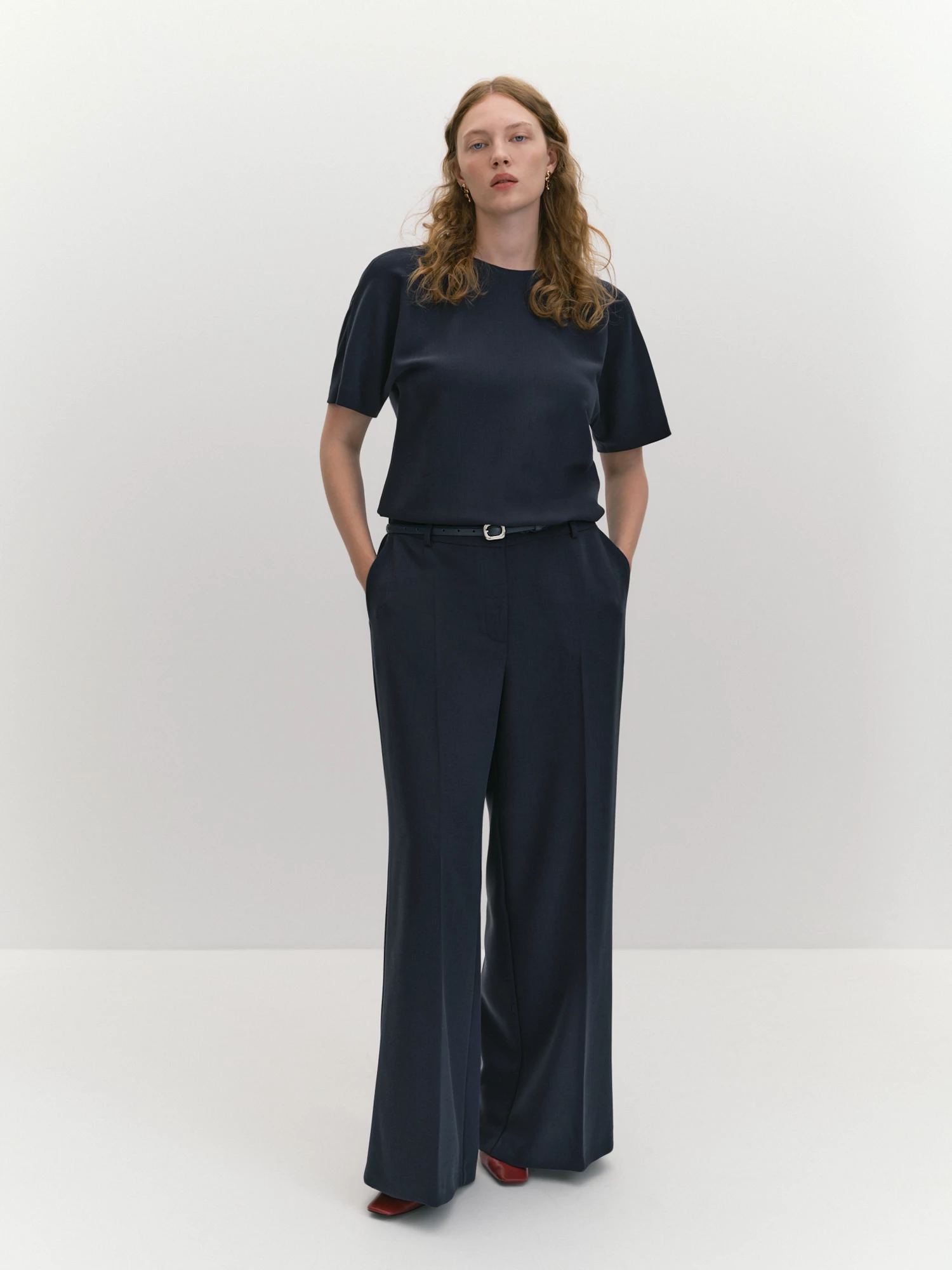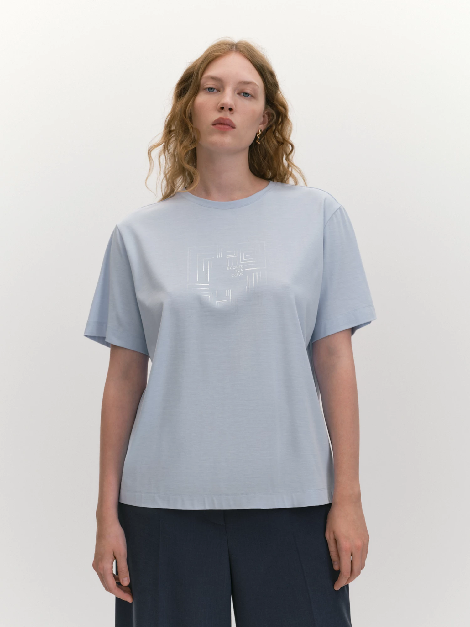 Футболка с лого-принтом Ecoute ton coeur (рус. Слушай свое сердце) - это продолжение манифеста, провозглашенного в рамках бренд-платформы ELIS "Выбираю себя". Выражая любовь и уважение к себе каждый день, женщина ELIS выбирает понятные четкие образы, дающие уверенность. Небесно-голубой отличная база для дизайнерского принта с глубоким смыслом, отпечатанного на оборудовании PRISM на собственном производстве полного цикла. Выполнили модель в актуальном прямом силуэте, с круглым вырезом и втачным рукавом со спущенным плечом, из тактильно приятного вискозного трикотажа. Футболка будет прекрасным дополнением к джинсам и брюкам из коллекции, а также под пиджак.