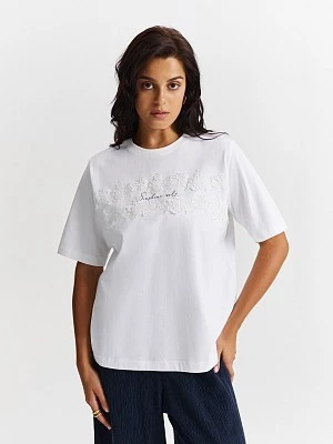 Лаконичная футболка в белом цвете станет отличной базой для вашего гардероба. Модель выполнена из 100% хлопка, который наделен такими свойствами, как легкость, мягкость и износостойкость. Светлые оттенки освежают образ, делая его легким и воздушным. Изюминкой изделия является изящный принт с тонкой надписью, который придает образу женственности и элегантности. Свободный крой обеспечивает комфортную посадку на любой тип фигуры и позволяет носить футболку как самостоятельно, так и как нижний слой с базовой рубашкой, комбинируя ее с брюками или джинсами.