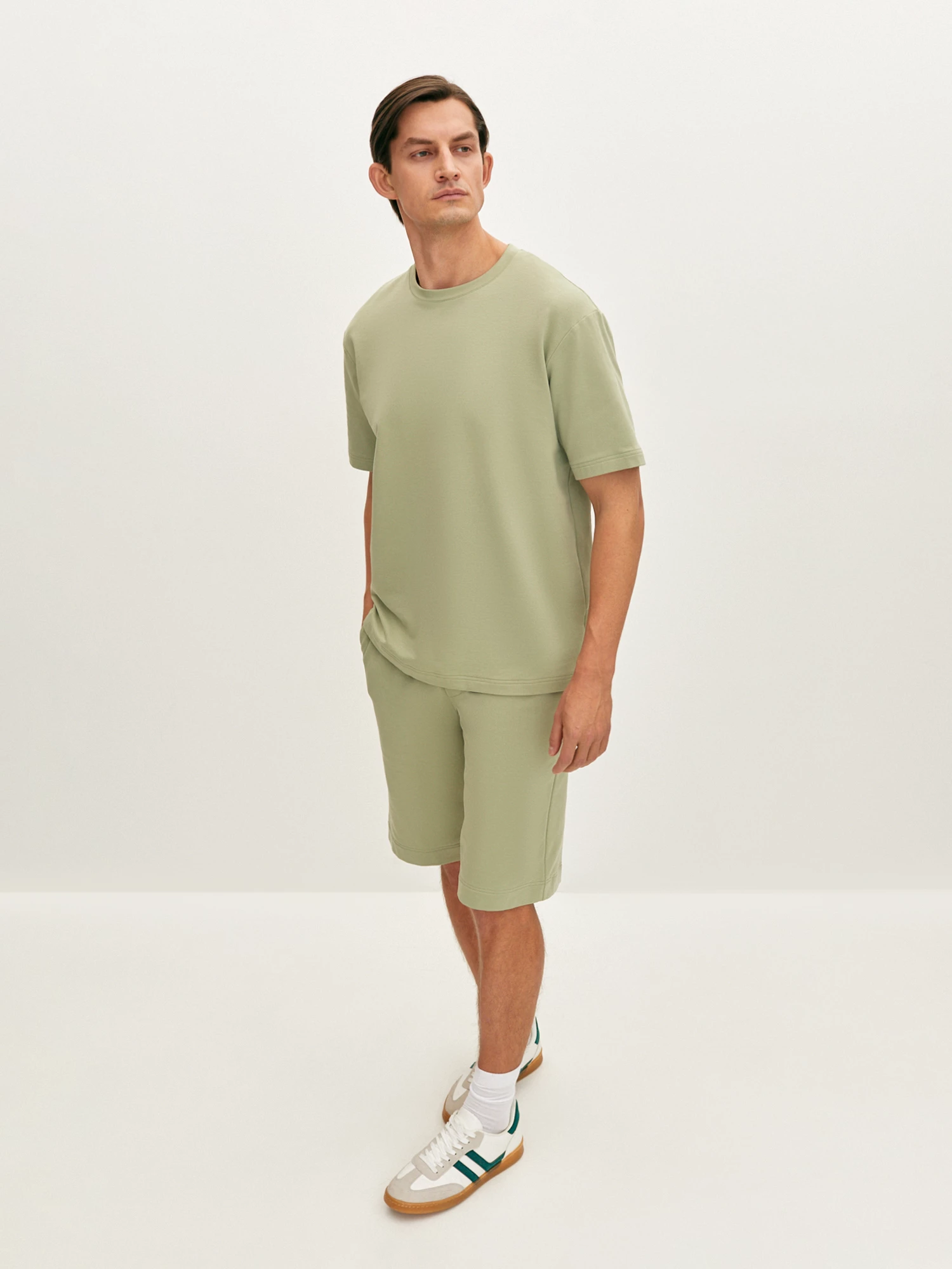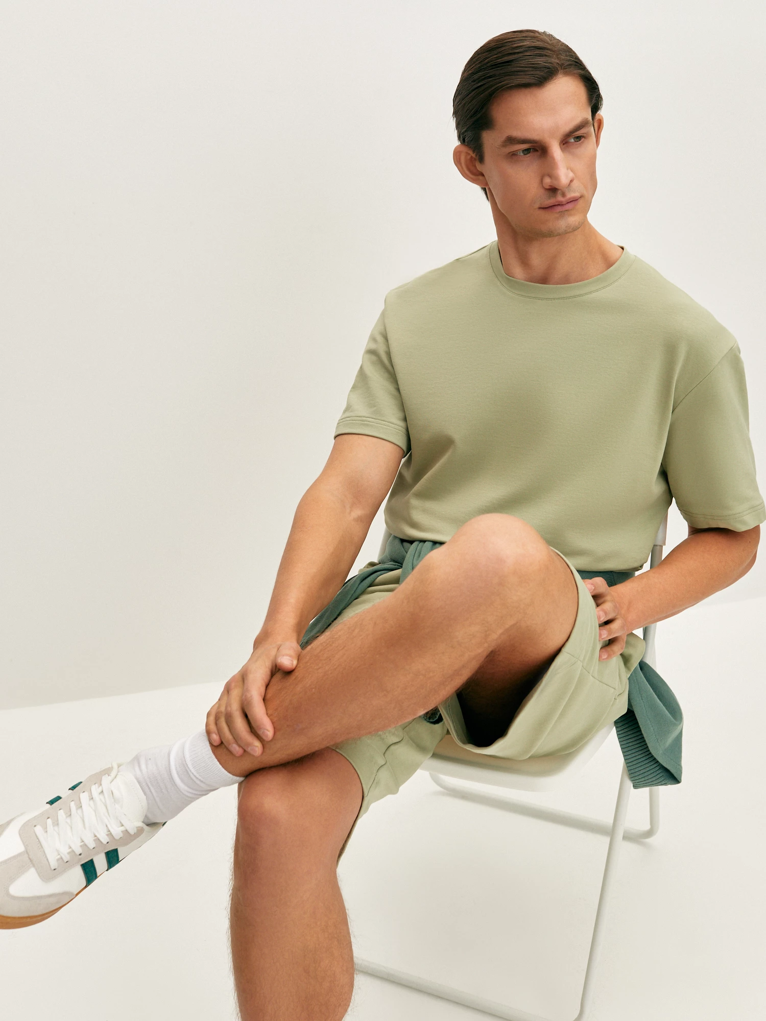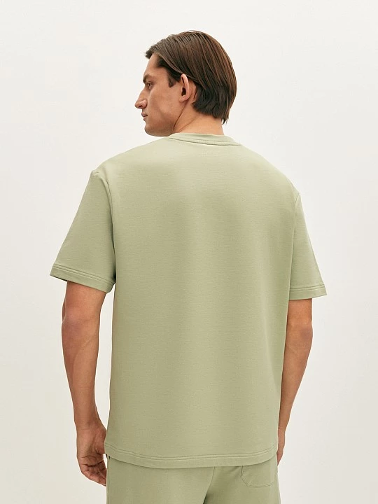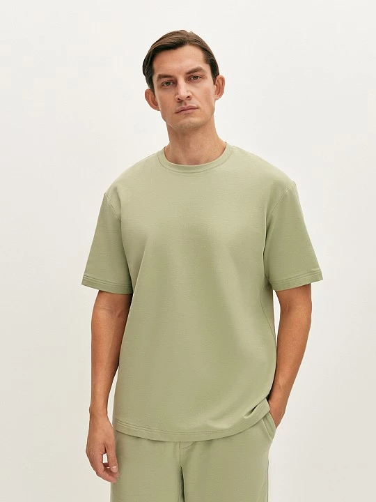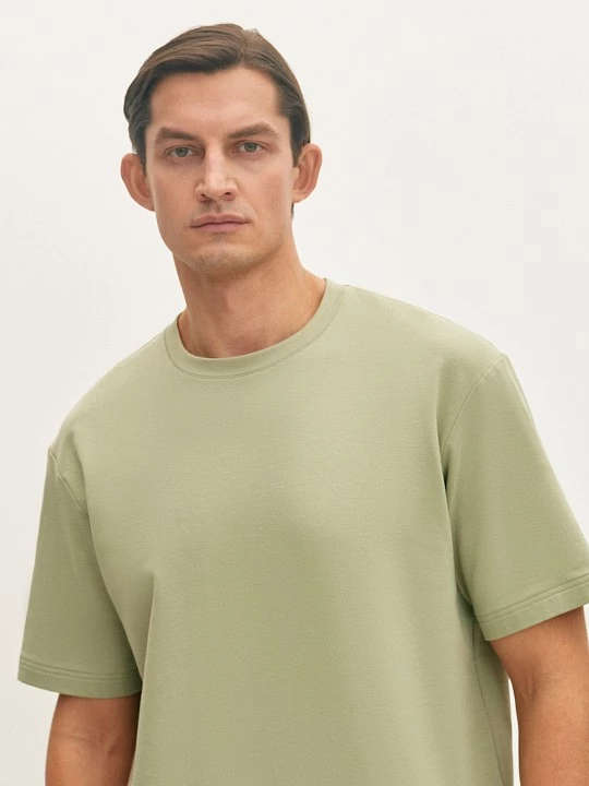 Футболка приятного фисташкового оттенка свободного кроя станет отличным выбором для весеннего гардероба. Выполненная из плотного хлопка, футболка обладает гигроскопичными свойствами и отлично держит форму, а свободный силуэт обеспечивает свободу движений. Модель со спущенной линией плеча и коротким рукавом. Футболка будет прекрасным дополнением к спортивным шортам из этой же ткани и составит комфортный образ для активного отдыха.