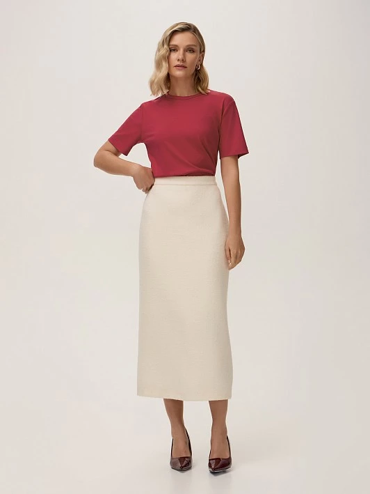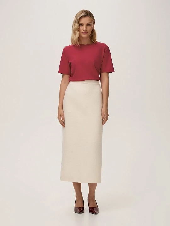 Юбка выполнена с подчеркивающим талию притачным поясом и застежкой на молнию сзади. По низу центрального шва спинки - высокая шлица для уверенности шага. Классический цвет "белый алиссум" и лаконичный дизайн делают юбку универсальной — она идеально дополнит образы в стиле old money или повседневный casual.