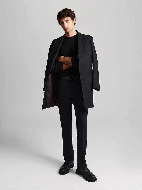 Прямые по ноге, слегка зауженные брюки из вискозной костюмной ткани на частичной подкладке. Полотно с фактурным узором, напоминающим соты, в темно-синем меланже. Ценность такой ткани в том, что при ее производстве используются нити разных оттенков основного цвета. Модель на притачном поясе, выполненном со шлевками, на корсажной ленте демонстрирует отличную посадку и дисциплинирует. Брюки с застежкой-гульфиком, косыми боковыми карманами, усиленными закрепками и задними карманами с листочкой и фиксацией на пуговицу. Для продления срока службы изделия по передним полотнищам брюк добавлена частичная подкладка, той же подкладочной тканью с изнаночной стороны закрыта застежка. Темно-синие базовые брюки станут удачным дополнением к неформальным офисным пиджакам, рубашкам, свитшотам, водолазкам, свитерам и джемперам.