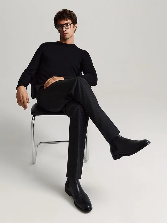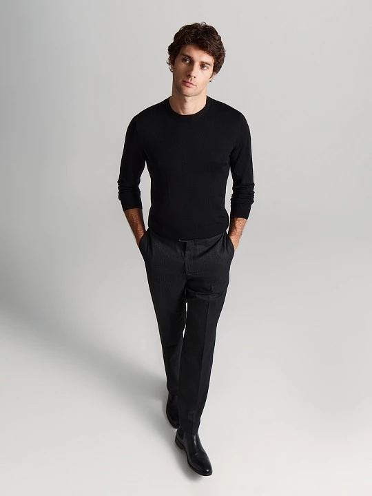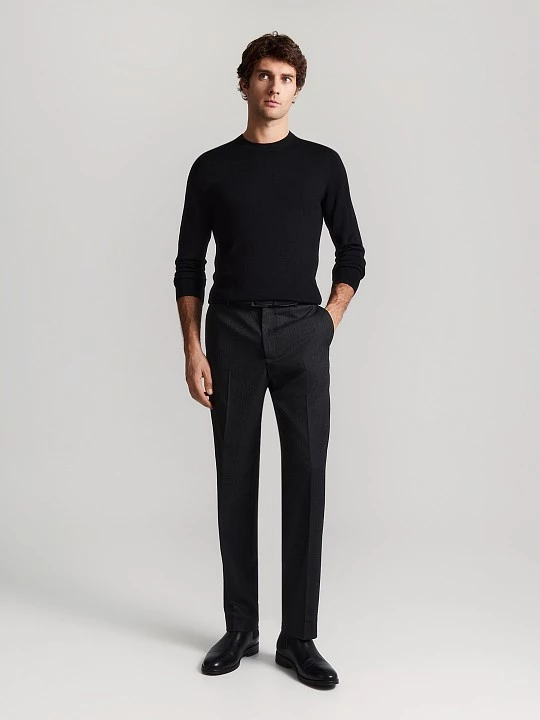 Прямые по ноге, слегка зауженные брюки из вискозной костюмной ткани на частичной подкладке. Выбрали для модели вискозное полотно в черном меланжевом. Ценность такой ткани в том, что при ее производстве используются нити разных оттенков основного цвета. Модель на притачном поясе, выполненном со шлевками, на корсажной ленте демонстрирует отличную посадку и дисциплинирует. Брюки с застежкой-гульфиком, косыми боковыми карманами, усиленными закрепками и задними карманами "в рамку" с фиксацией на пуговицу. Для продления срока службы изделия по передним полотнищам брюк добавлена частичная подкладка, той же подкладочной тканью с изнаночной стороны закрыта застежка. Базовые брюки в меланжевом черном станут удачным дополнением к неформальным офисным пиджакам, рубашкам, свитшотам, водолазкам, свитерам и джемперам.