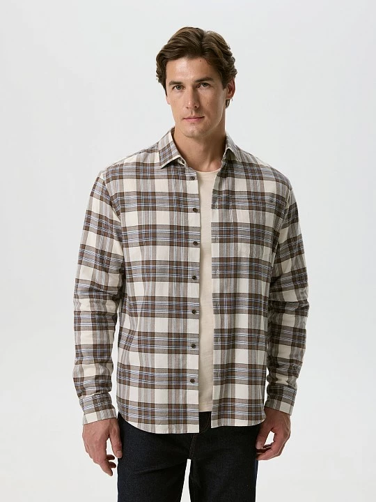 Рубашка в классическую бежево-коричневую клетку выполнена из мягкой хлопчатобумажной фланели. Модель комфортного силуэта regular fit, с длинным рукавом, лаконичного кроя: отложной воротник на отрезной стойке, центральная застежка на пуговицы, закругленный низ. Узкая кокетка и бантовая складка обеспечивают хорошую посадку по спине и плечам. Декоративная петля добавлена в поддержку стиля. Привлекает внимание нагрудный карман со скошенным углом. Хлопок гипоаллергенен, хорошо дышит, удобен в эксплуатации. Фланель при стирке не садится и не линяет, если температура воды не превышает рекомендованную. Теплая сорочка будет востребована как неформальная офисная, школьная, повседневная. Наши дизайнеры рекомендуют носить ее в паре с футболкой или водолазкой, чтобы создать модную многослойность.